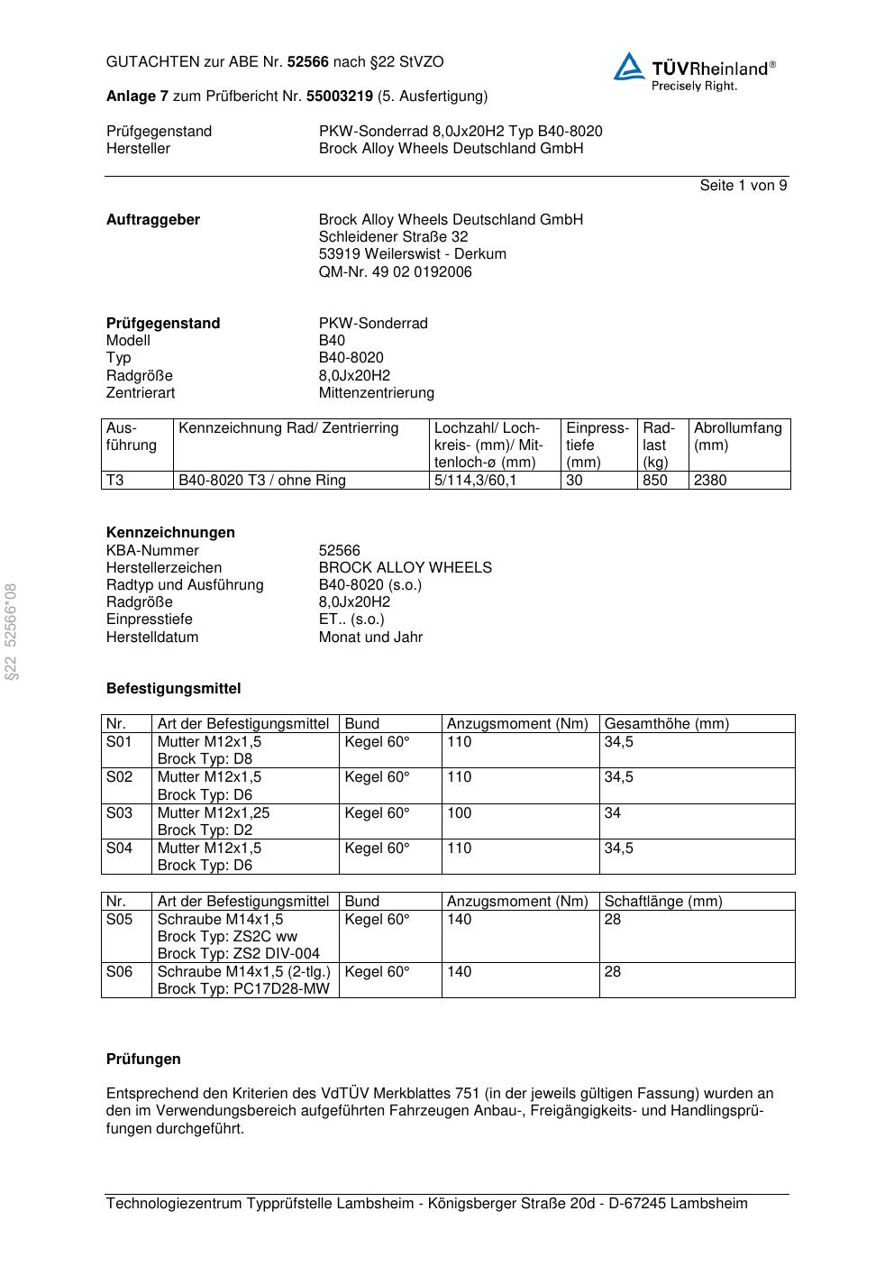 Felgengutachten / abe für Alufelgen Brock B40-8020 (8Jx2 ET 0, Mittenloch 0 mm) mit KBA 52566 (Zertifikatsnummer 52566). Hier kostenlos als PDF herunterladen. Der Download-Link ist 24 Stunden gültig und kann bis zu zwei Mal verwendet werden.