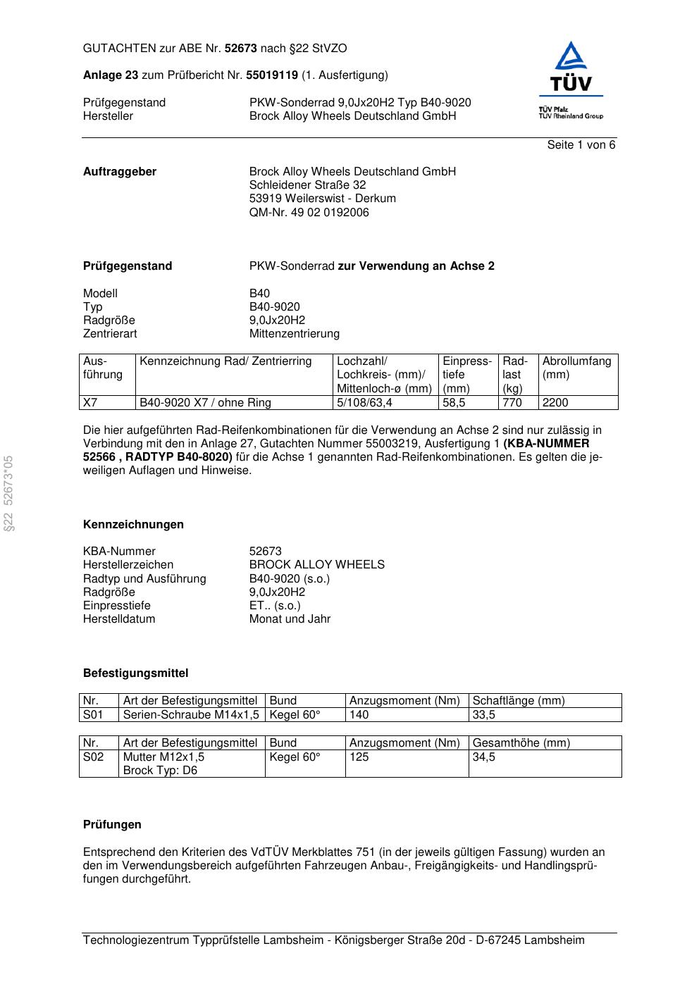 Felgengutachten / abe für Alufelgen Brock B40-9020 (9Jx2 ET 0, Mittenloch 0 mm) mit KBA 52673 (Zertifikatsnummer 52673). Hier kostenlos als PDF herunterladen. Der Download-Link ist 24 Stunden gültig und kann bis zu zwei Mal verwendet werden.