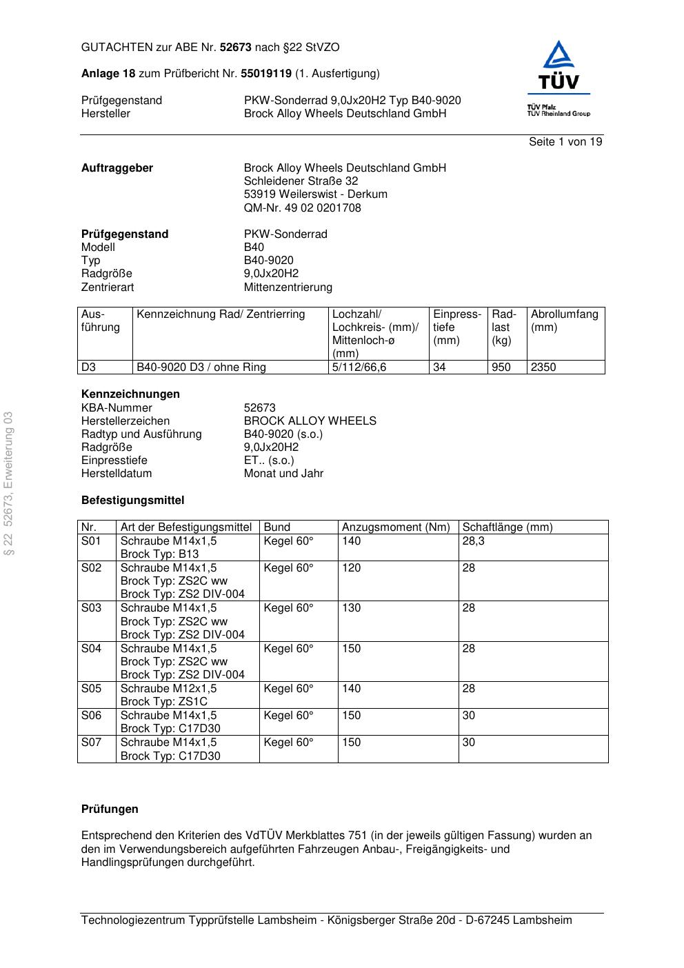 Felgengutachten / abe für Alufelgen Brock B40-9020 (9Jx2 ET 0, Mittenloch 0 mm) mit KBA 52673 (Zertifikatsnummer 52673). Hier kostenlos als PDF herunterladen. Der Download-Link ist 24 Stunden gültig und kann bis zu zwei Mal verwendet werden.