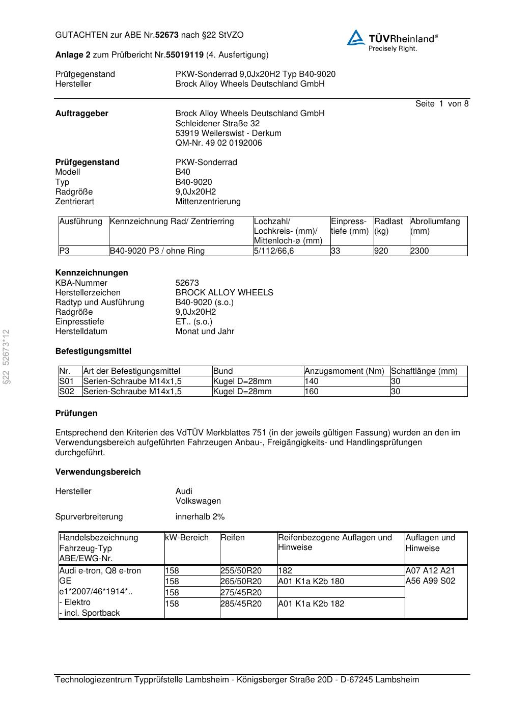 Felgengutachten / abe für Alufelgen Brock B40-9020 (9Jx2 ET 0, Mittenloch 0 mm) mit KBA 52673 (Zertifikatsnummer 52673). Hier kostenlos als PDF herunterladen. Der Download-Link ist 24 Stunden gültig und kann bis zu zwei Mal verwendet werden.