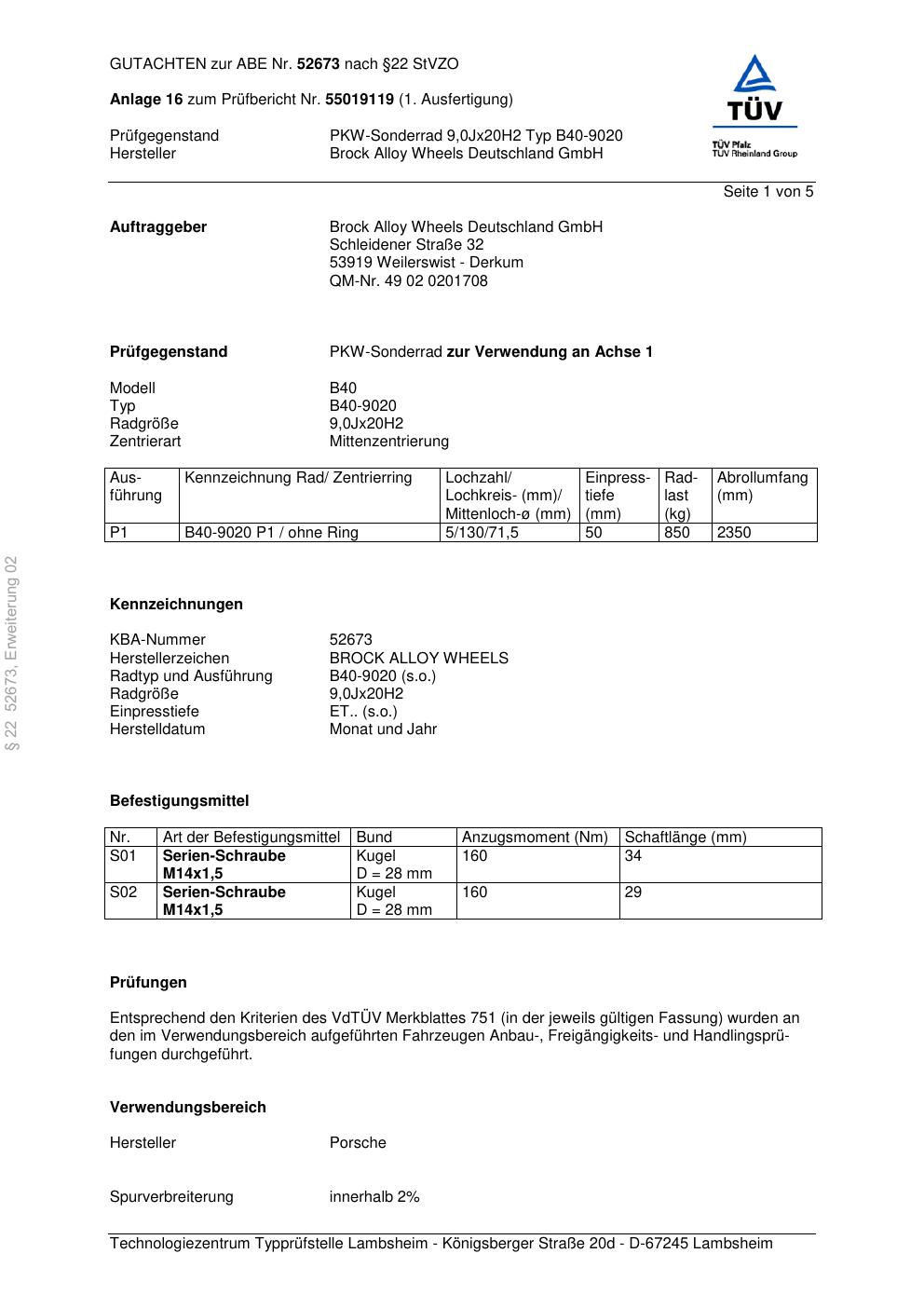Felgengutachten / abe für Alufelgen Brock B40-9020 (9Jx2 ET 0, Mittenloch 0 mm) mit KBA 52673 (Zertifikatsnummer 52673). Hier kostenlos als PDF herunterladen. Der Download-Link ist 24 Stunden gültig und kann bis zu zwei Mal verwendet werden.