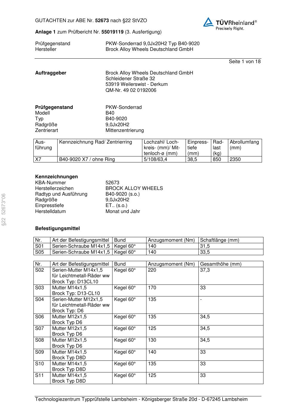 Felgengutachten / abe für Alufelgen Brock B40-9020 (9Jx2 ET 0, Mittenloch 0 mm) mit KBA 52673 (Zertifikatsnummer 52673). Hier kostenlos als PDF herunterladen. Der Download-Link ist 24 Stunden gültig und kann bis zu zwei Mal verwendet werden.