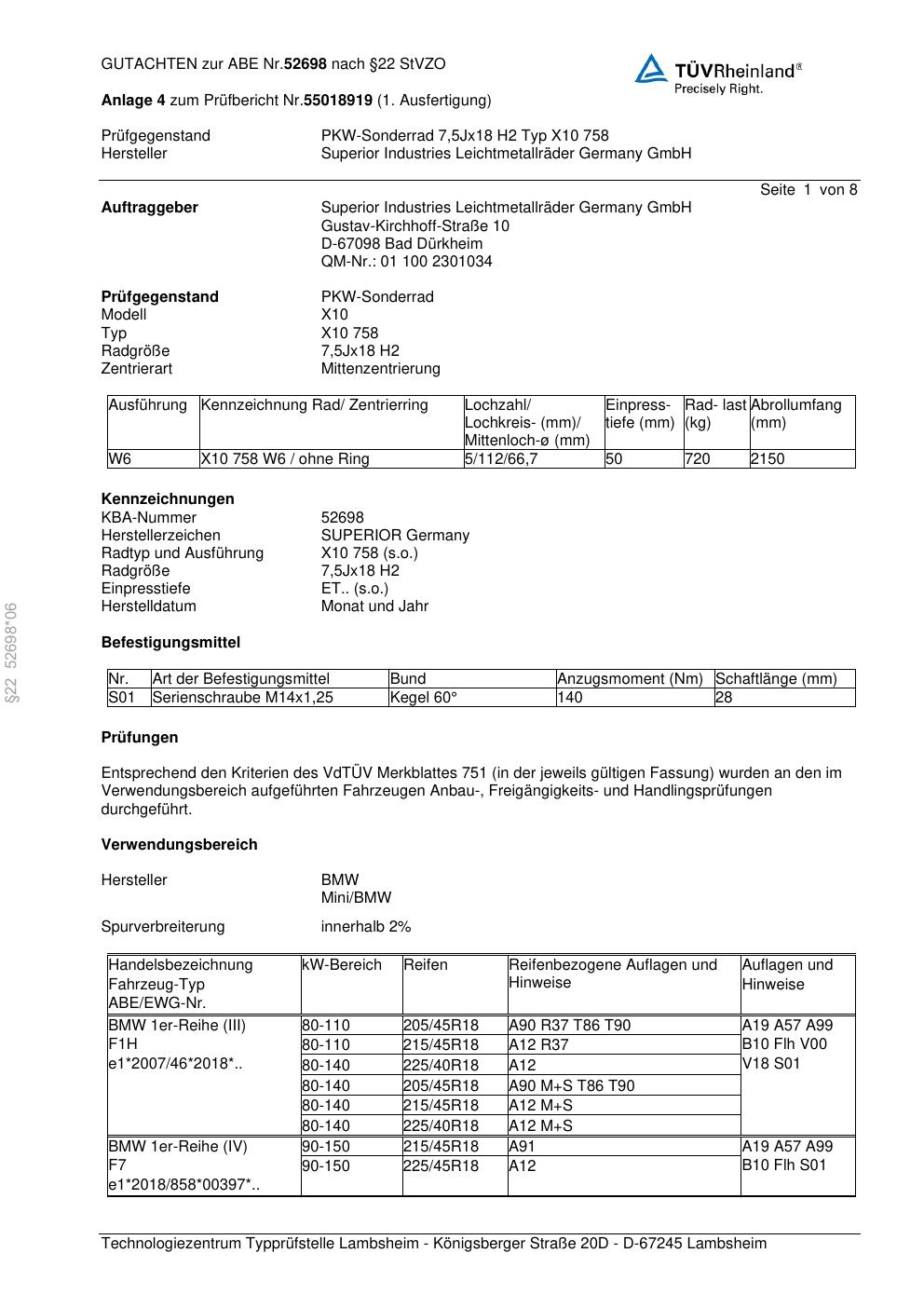 Dieses Gutachten (abe) bezieht sich auf die Alufelge Superior X10 758 in der Ausführung 7.5Jx18 ET 0, Mittenloch 0 mm (KBA 52698). Im PDF findest du typischerweise zulässige Reifengrößen, Auflagen/Anbauhinweise und – je nach Dokument – Hinweise zur Eintragung.