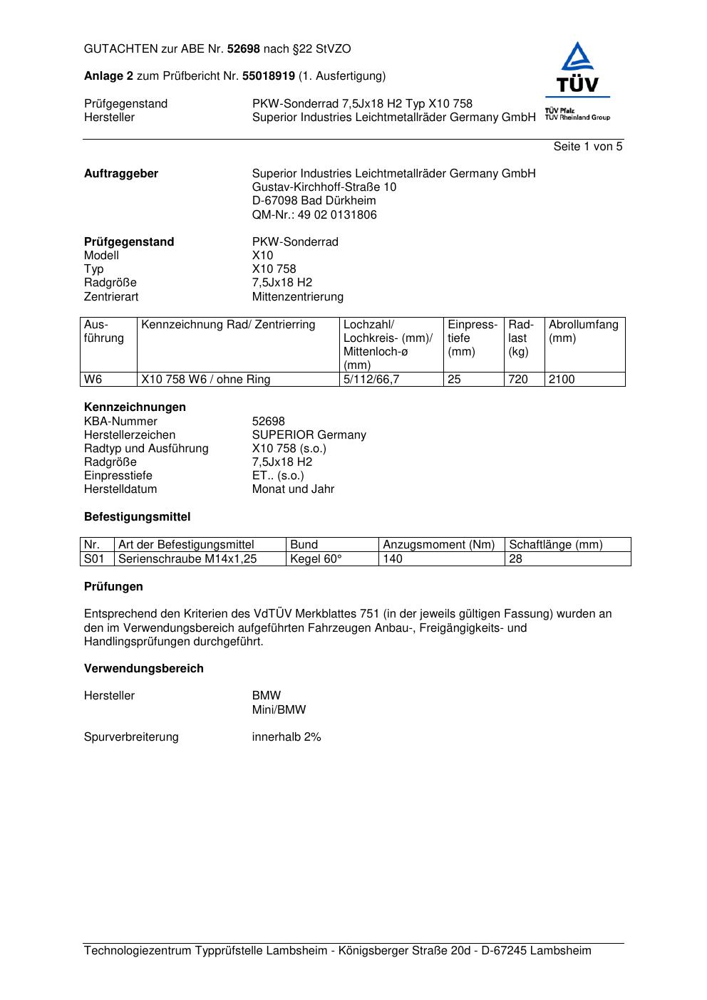 Dieses Gutachten (abe) bezieht sich auf die Alufelge Superior X10 758 in der Ausführung 7.5Jx18 ET 0, Mittenloch 0 mm (KBA 52698). Im PDF findest du typischerweise zulässige Reifengrößen, Auflagen/Anbauhinweise und – je nach Dokument – Hinweise zur Eintragung.