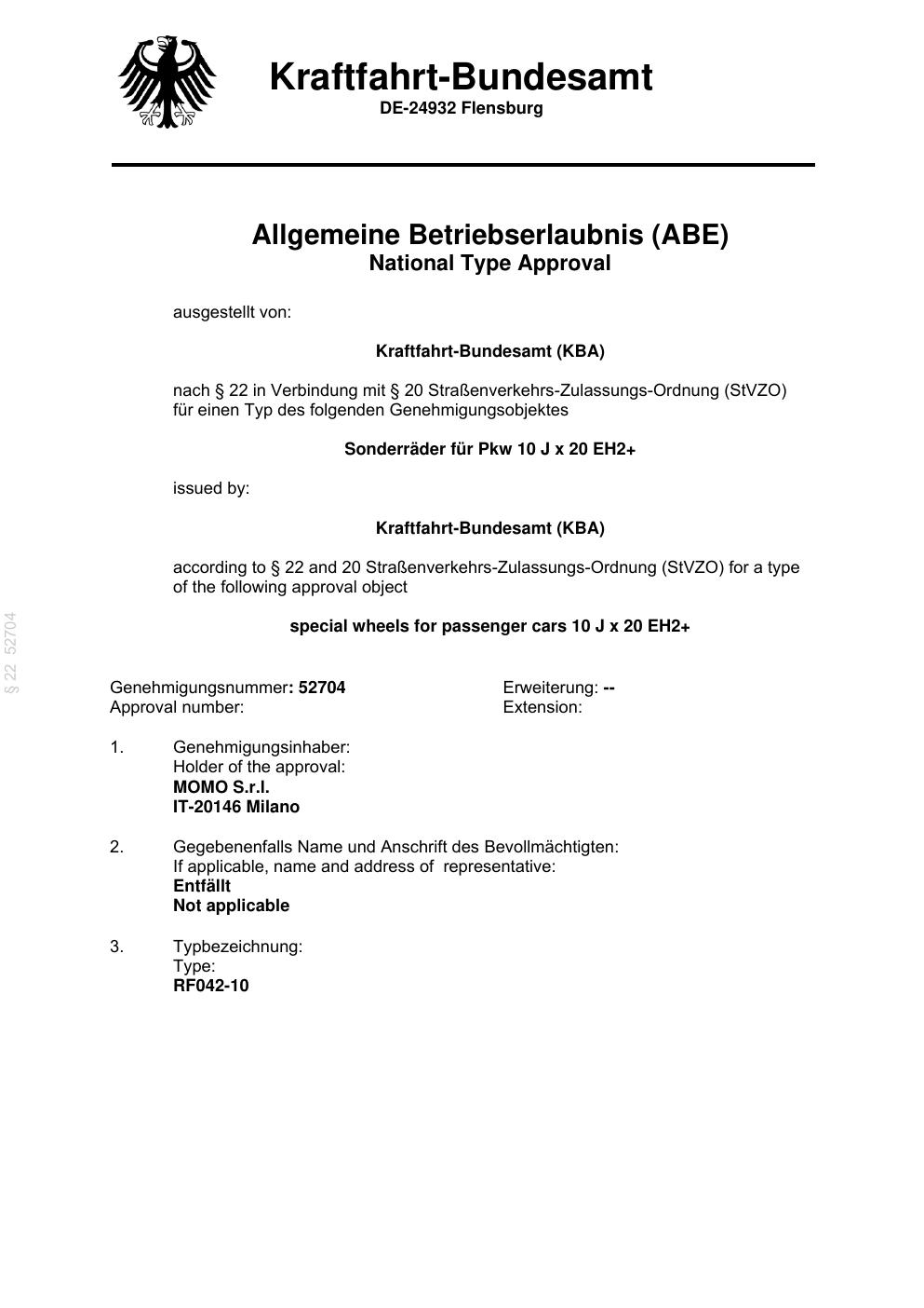 Dieses Gutachten (abe) bezieht sich auf die Alufelge brand-momo RFX013-105 in der Ausführung 10Jx2 ET 0, Mittenloch 0 mm (KBA 52704). Im PDF findest du typischerweise zulässige Reifengrößen, Auflagen/Anbauhinweise und – je nach Dokument – Hinweise zur Eintragung.