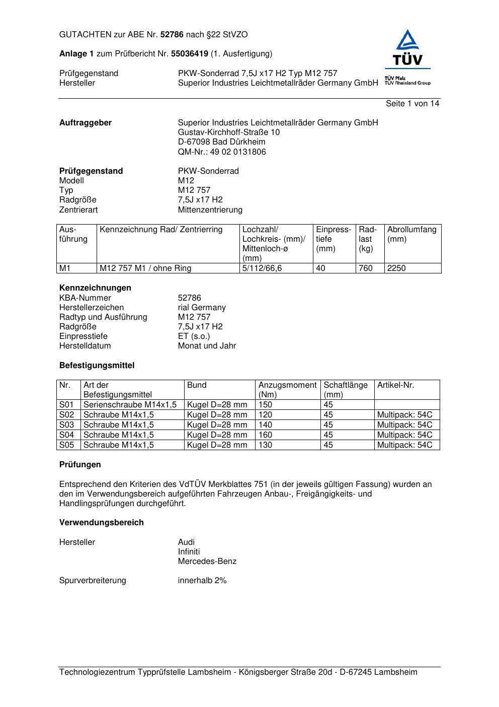 Dieses Gutachten (abe) bezieht sich auf die Alufelge brand-rial M12 75 7 in der Ausführung 7.5Jx17 ET 0, Mittenloch 0 mm (KBA 52786). Im PDF findest du typischerweise zulässige Reifengrößen, Auflagen/Anbauhinweise und – je nach Dokument – Hinweise zur Eintragung.