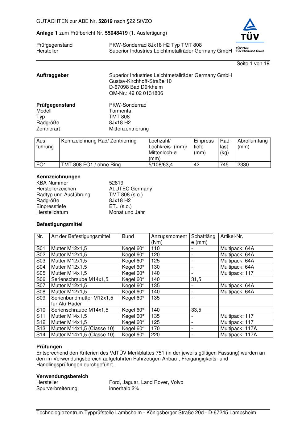 Dieses Gutachten (abe) bezieht sich auf die Alufelge ALUTEC TMT 808 in der Ausführung 8Jx18 ET 0, Mittenloch 0 mm (KBA 52819). Im PDF findest du typischerweise zulässige Reifengrößen, Auflagen/Anbauhinweise und – je nach Dokument – Hinweise zur Eintragung.