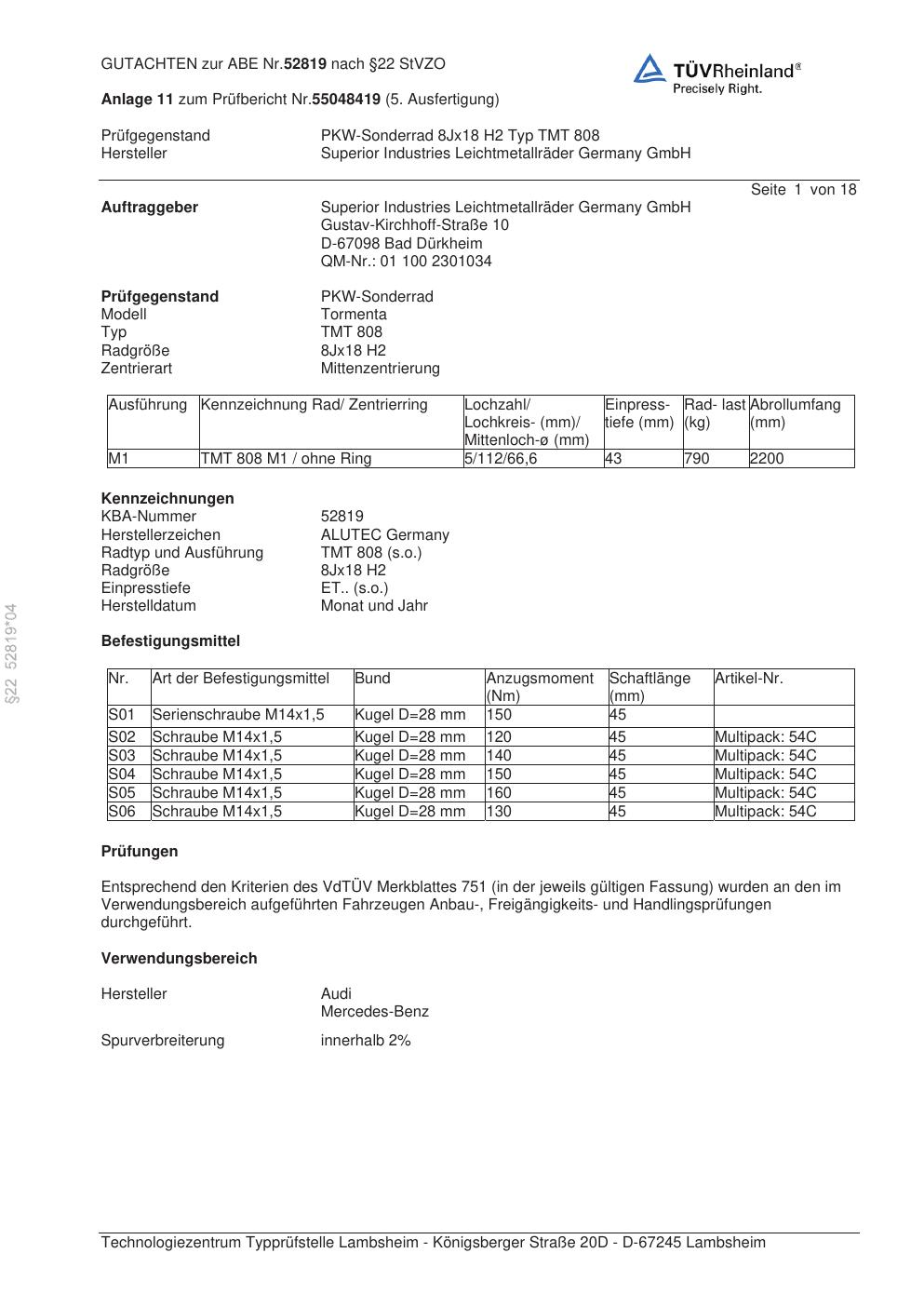 Dieses Gutachten (abe) bezieht sich auf die Alufelge ALUTEC TMT 808 in der Ausführung 8Jx18 ET 0, Mittenloch 0 mm (KBA 52819). Im PDF findest du typischerweise zulässige Reifengrößen, Auflagen/Anbauhinweise und – je nach Dokument – Hinweise zur Eintragung.