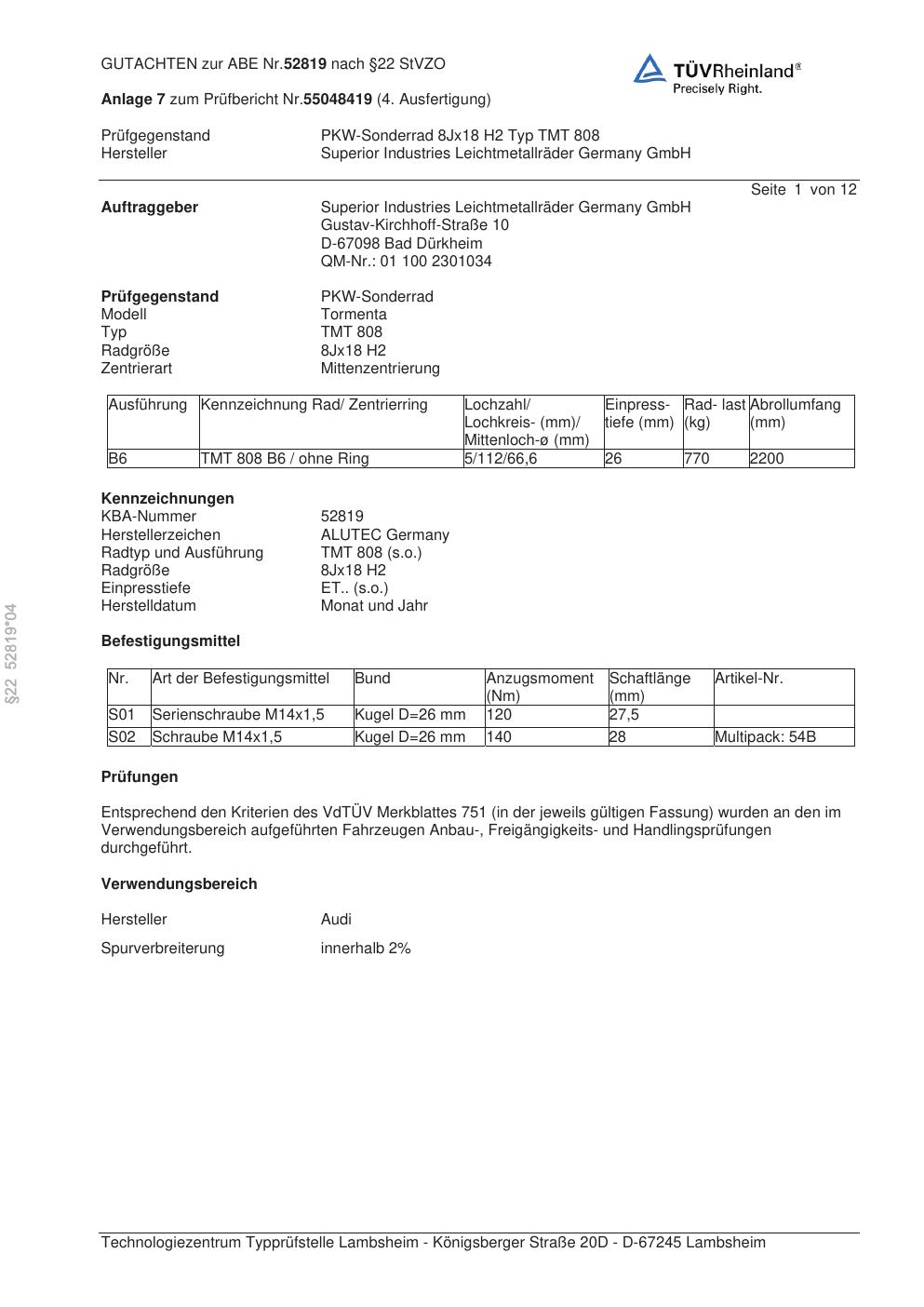 Dieses Gutachten (abe) bezieht sich auf die Alufelge ALUTEC TMT 808 in der Ausführung 8Jx18 ET 0, Mittenloch 0 mm (KBA 52819). Im PDF findest du typischerweise zulässige Reifengrößen, Auflagen/Anbauhinweise und – je nach Dokument – Hinweise zur Eintragung.