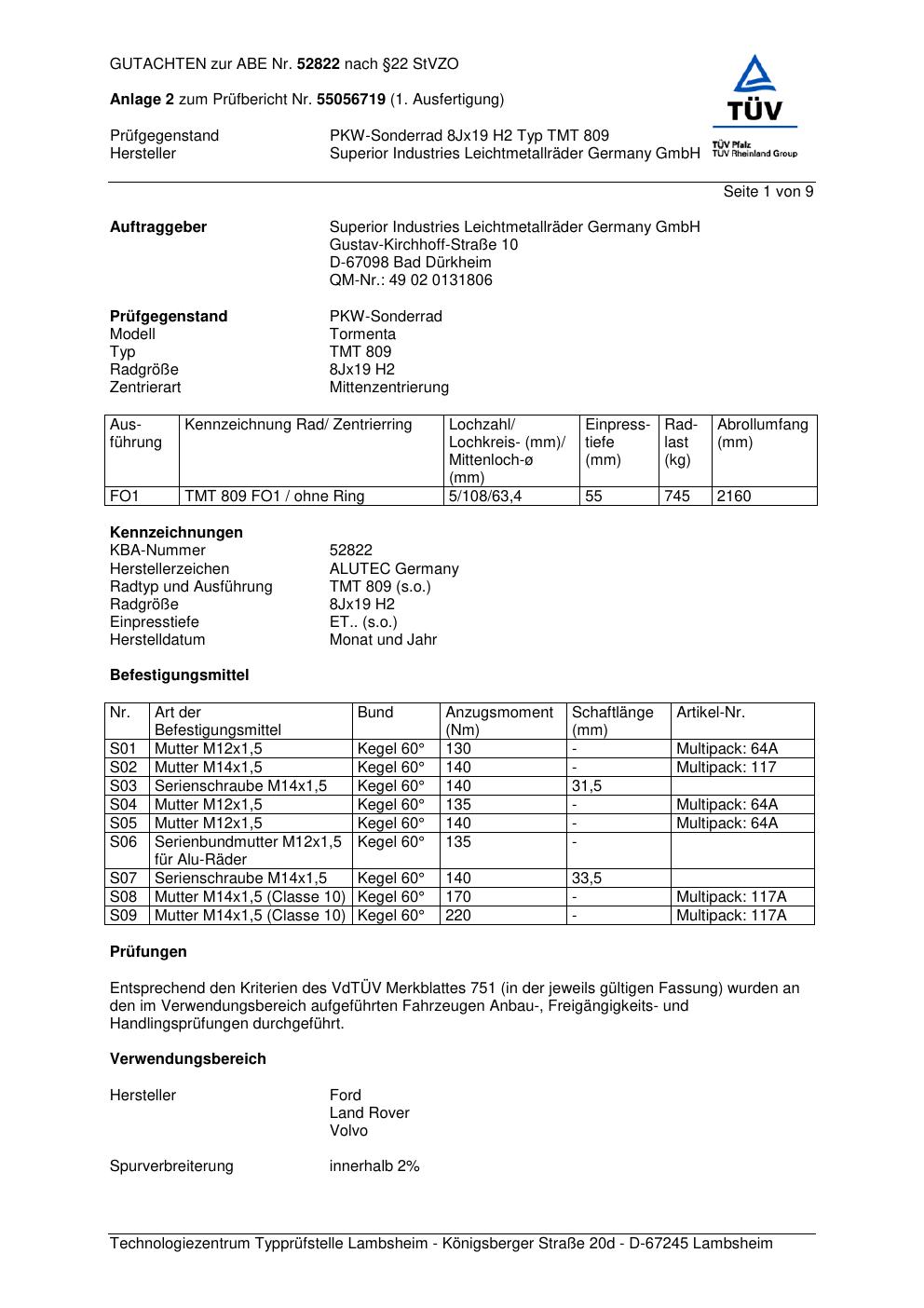 Dieses Gutachten (abe) bezieht sich auf die Alufelge ALUTEC TMT 809 in der Ausführung 8Jx19 ET 0, Mittenloch 0 mm (KBA 52822). Im PDF findest du typischerweise zulässige Reifengrößen, Auflagen/Anbauhinweise und – je nach Dokument – Hinweise zur Eintragung.