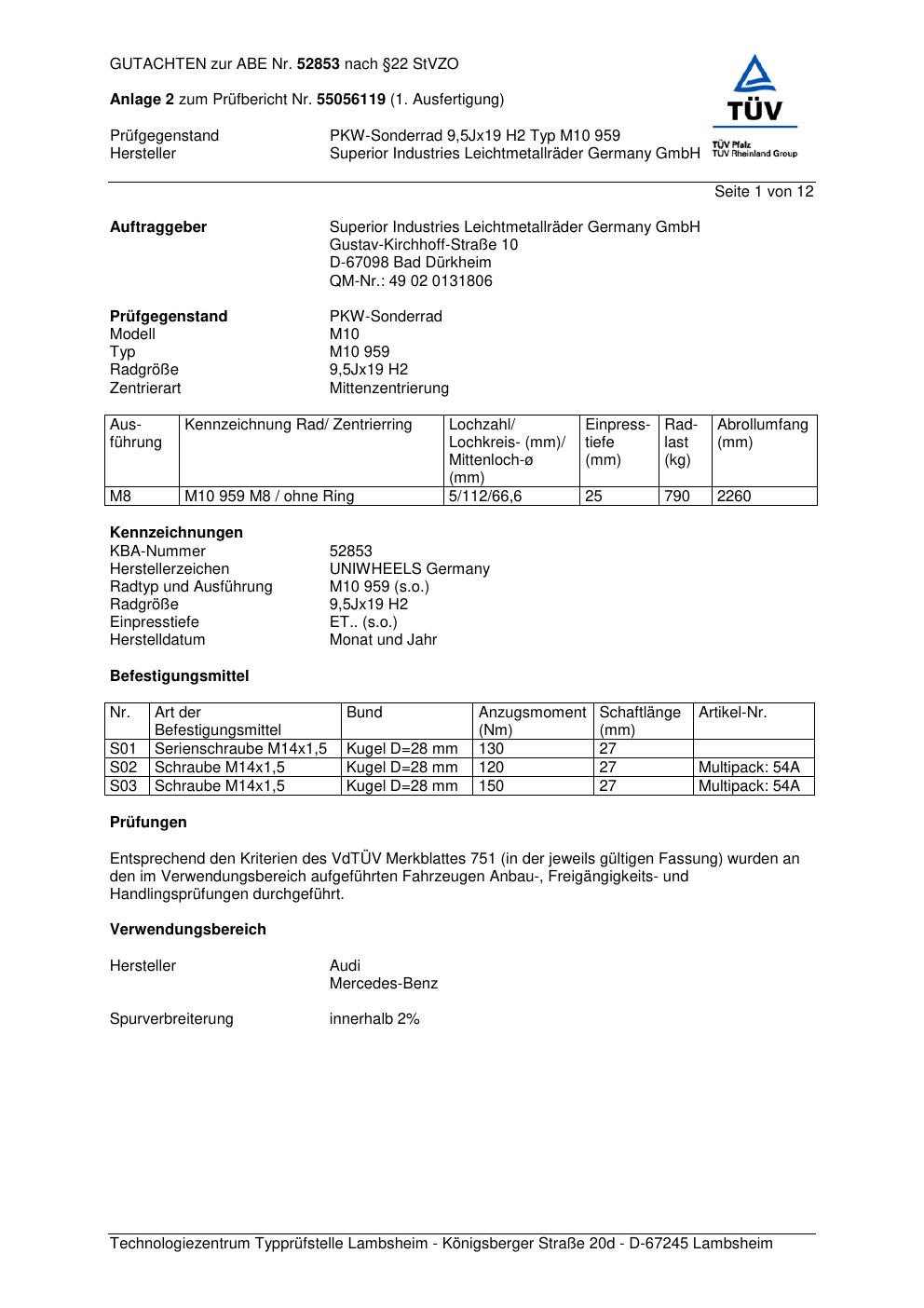 Dieses Gutachten (abe) bezieht sich auf die Alufelge Superior M10 959 in der Ausführung 9.5Jx19 ET 0, Mittenloch 0 mm (KBA 52853). Im PDF findest du typischerweise zulässige Reifengrößen, Auflagen/Anbauhinweise und – je nach Dokument – Hinweise zur Eintragung.