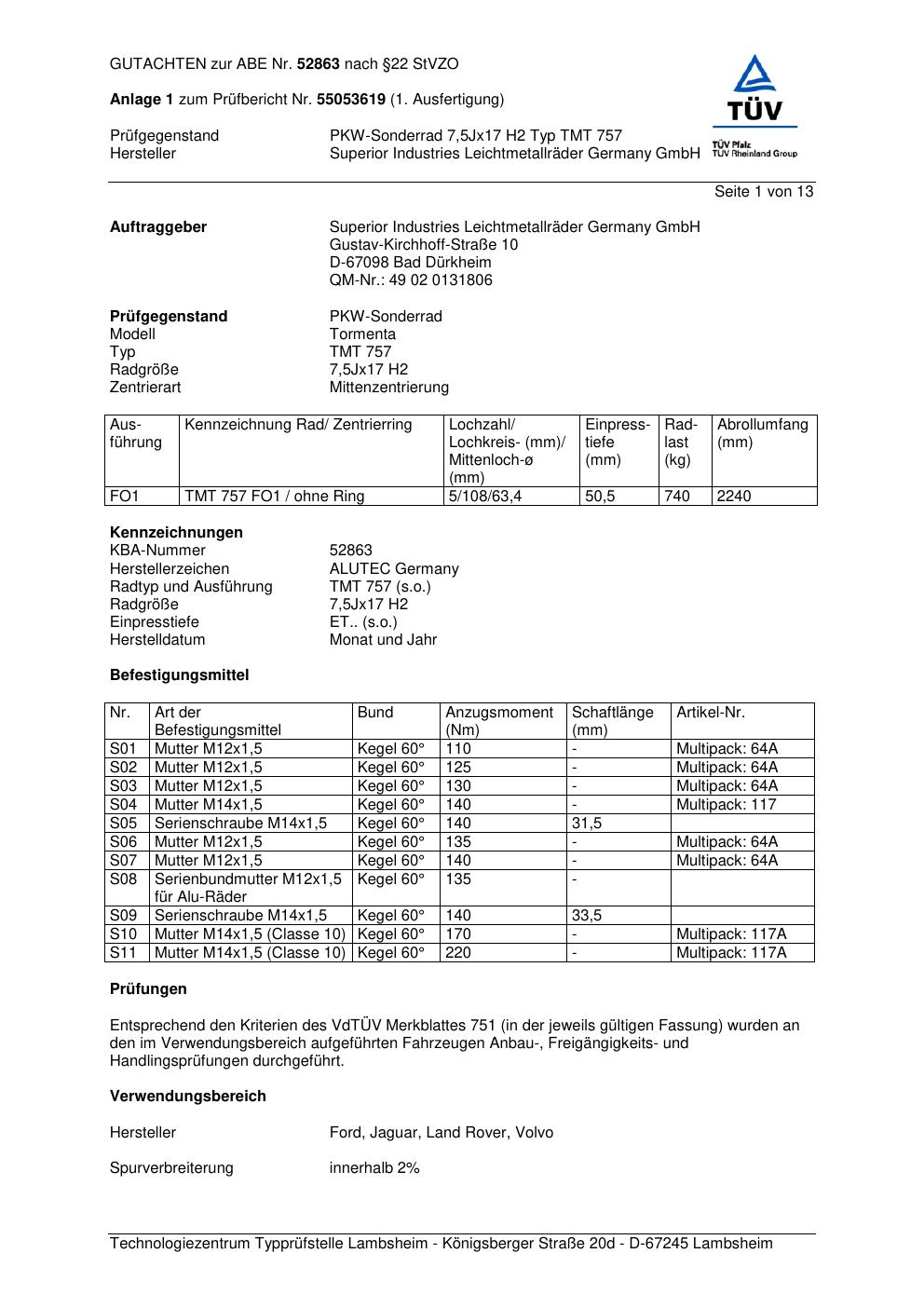 Dieses Gutachten (abe) bezieht sich auf die Alufelge ALUTEC TMT 757 in der Ausführung 7.5Jx17 ET 0, Mittenloch 0 mm (KBA 52863). Im PDF findest du typischerweise zulässige Reifengrößen, Auflagen/Anbauhinweise und – je nach Dokument – Hinweise zur Eintragung.