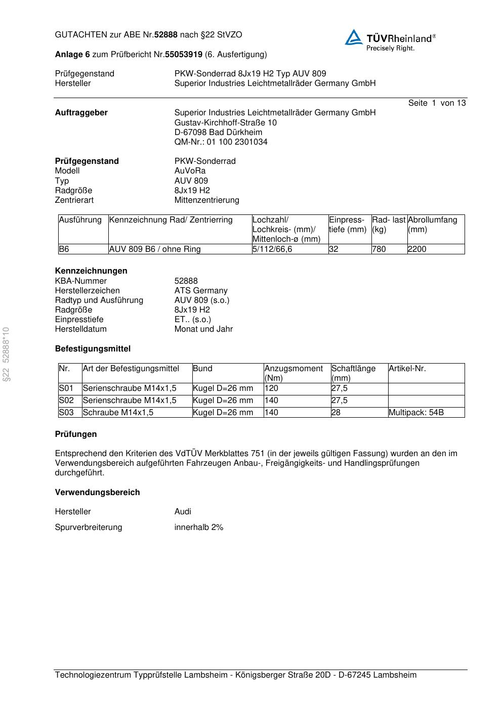 Dieses Gutachten (abe) bezieht sich auf die Alufelge ATS AUV 809 in der Ausführung 8Jx19 ET 0, Mittenloch 0 mm (KBA 52888). Im PDF findest du typischerweise zulässige Reifengrößen, Auflagen/Anbauhinweise und – je nach Dokument – Hinweise zur Eintragung.