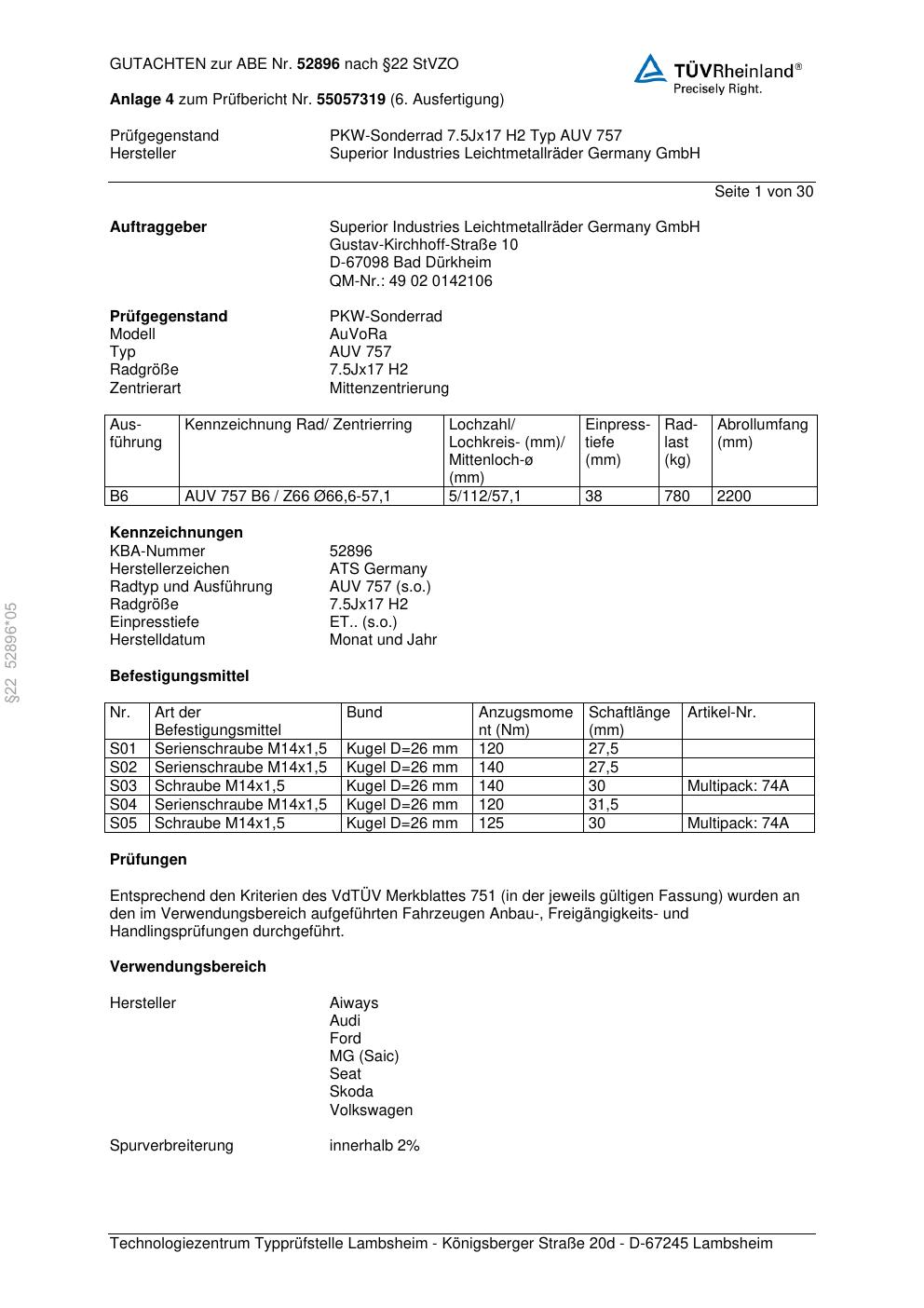 Dieses Gutachten (abe) bezieht sich auf die Alufelge ATS AUV 757 in der Ausführung 7.5Jx17 ET 0, Mittenloch 0 mm (KBA 52896). Im PDF findest du typischerweise zulässige Reifengrößen, Auflagen/Anbauhinweise und – je nach Dokument – Hinweise zur Eintragung.
