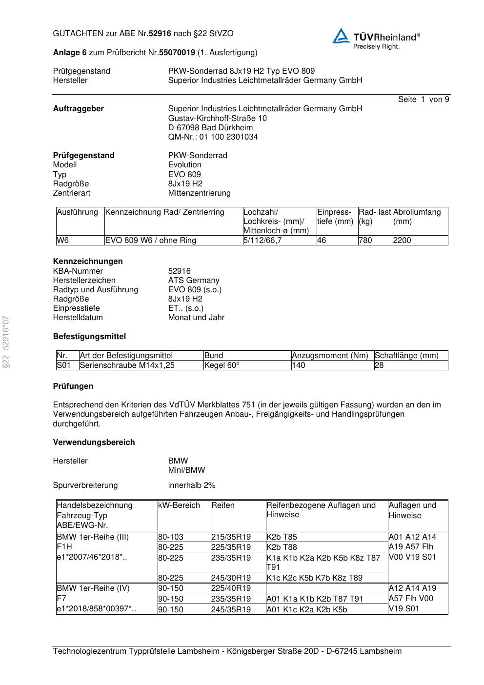 Dieses Gutachten (abe) bezieht sich auf die Alufelge ATS EVO 809 in der Ausführung 8Jx19 ET 0, Mittenloch 0 mm (KBA 52916). Im PDF findest du typischerweise zulässige Reifengrößen, Auflagen/Anbauhinweise und – je nach Dokument – Hinweise zur Eintragung.