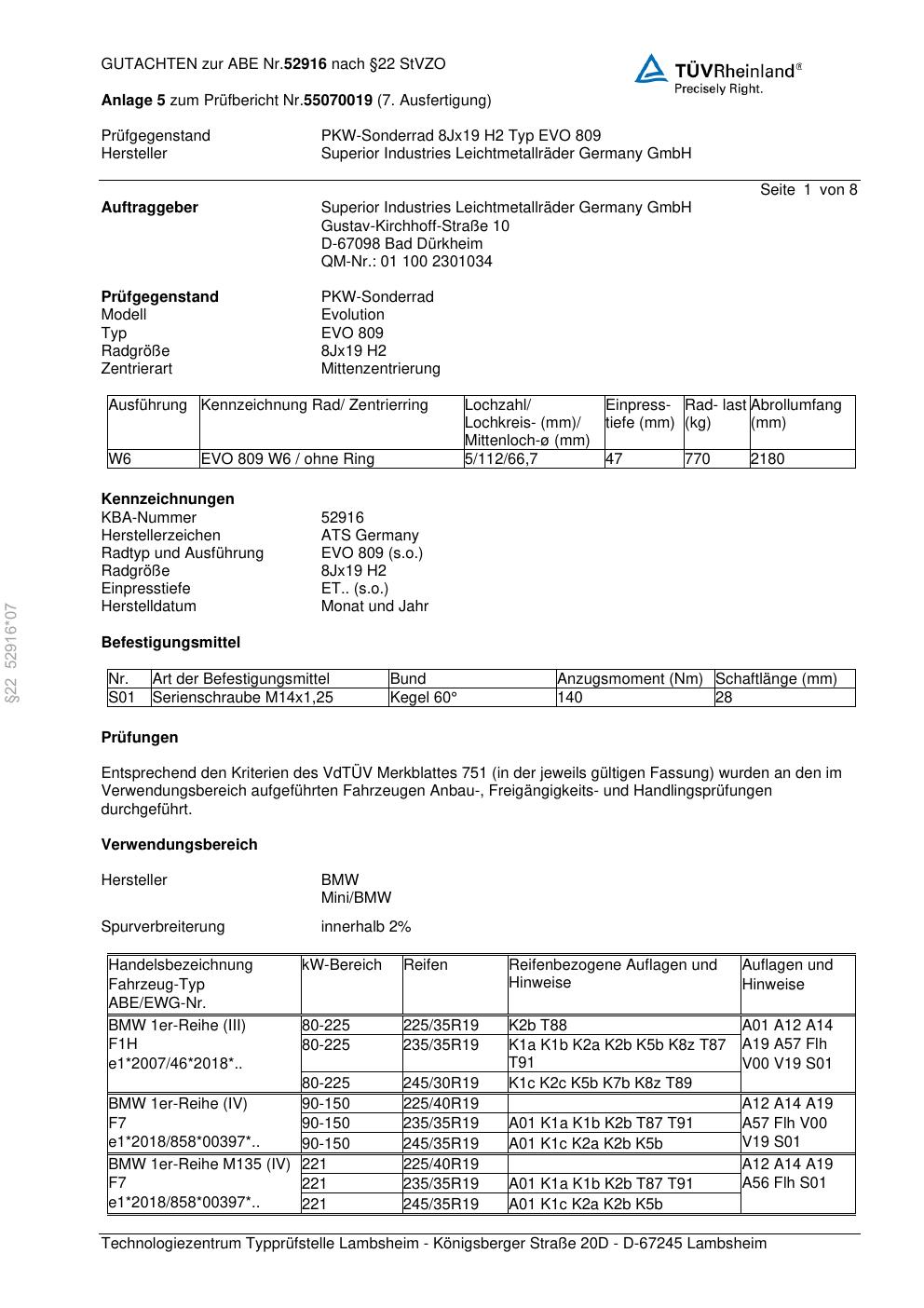 Dieses Gutachten (abe) bezieht sich auf die Alufelge ATS EVO 809 in der Ausführung 8Jx19 ET 0, Mittenloch 0 mm (KBA 52916). Im PDF findest du typischerweise zulässige Reifengrößen, Auflagen/Anbauhinweise und – je nach Dokument – Hinweise zur Eintragung.