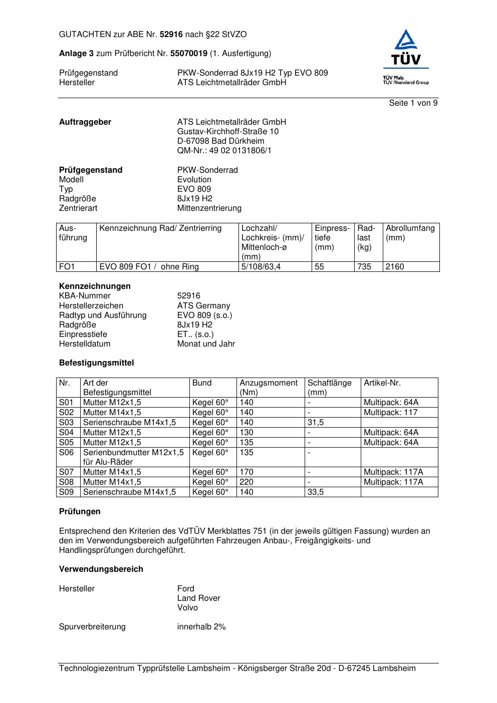 Dieses Gutachten (abe) bezieht sich auf die Alufelge ATS EVO 809 in der Ausführung 8Jx19 ET 0, Mittenloch 0 mm (KBA 52916). Im PDF findest du typischerweise zulässige Reifengrößen, Auflagen/Anbauhinweise und – je nach Dokument – Hinweise zur Eintragung.