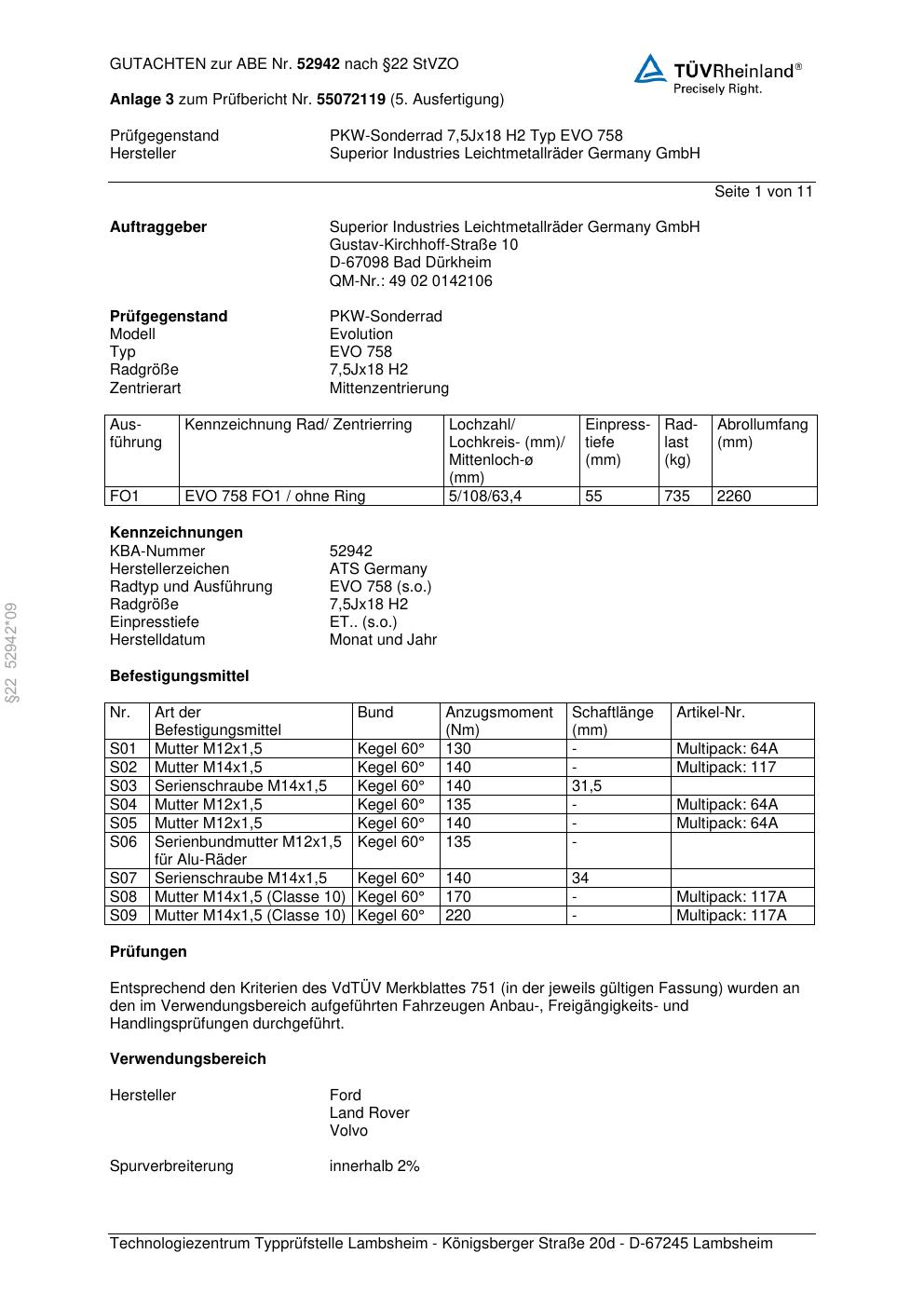 Felgengutachten / abe für Alufelgen ATS EVO 758 (7.5Jx18 ET 0, Mittenloch 0 mm) mit KBA 52942 (Zertifikatsnummer 52942). Hier kostenlos als PDF herunterladen. Der Download-Link ist 24 Stunden gültig und kann bis zu zwei Mal verwendet werden.