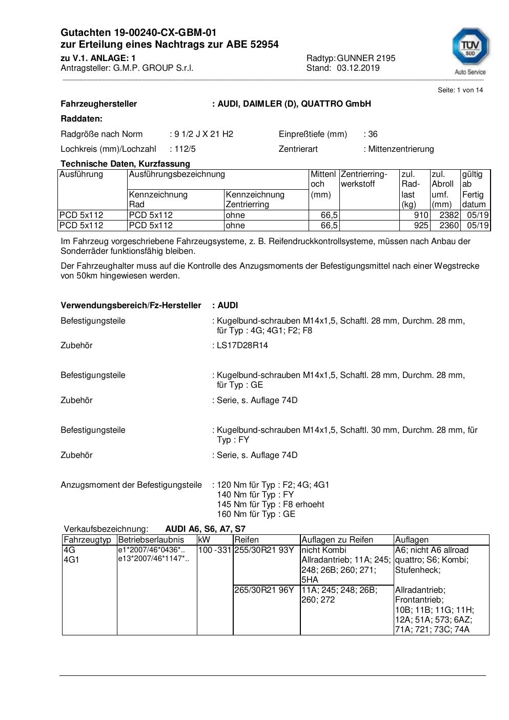 Felgengutachten / abe für Alufelgen ATS GUNNER 2195 (2Jx21 ET 0, Mittenloch 0 mm) mit KBA 52954 (Zertifikatsnummer 52954). Hier kostenlos als PDF herunterladen. Der Download-Link ist 24 Stunden gültig und kann bis zu zwei Mal verwendet werden.