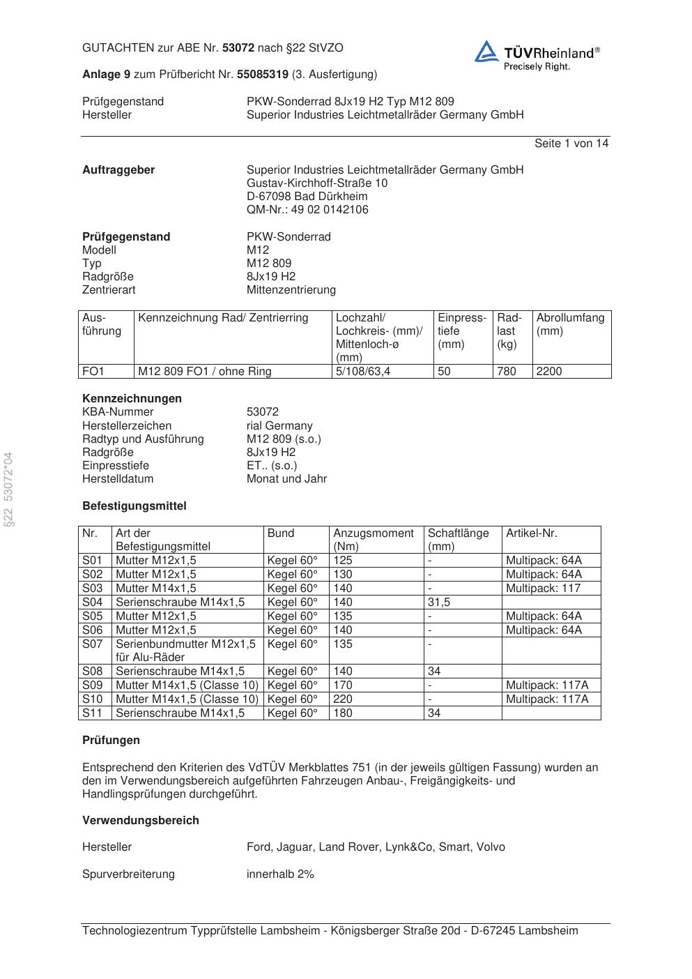 Dieses Gutachten (abe) bezieht sich auf die Alufelge brand-rial M12 809 in der Ausführung 8Jx19 ET 0, Mittenloch 0 mm (KBA 53072). Im PDF findest du typischerweise zulässige Reifengrößen, Auflagen/Anbauhinweise und – je nach Dokument – Hinweise zur Eintragung.