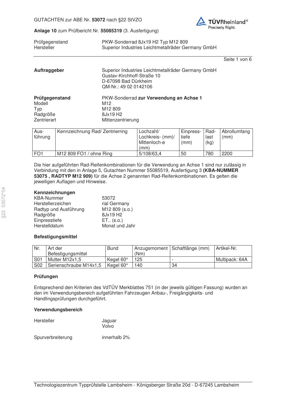 Dieses Gutachten (abe) bezieht sich auf die Alufelge brand-rial M12 809 in der Ausführung 8Jx19 ET 0, Mittenloch 0 mm (KBA 53072). Im PDF findest du typischerweise zulässige Reifengrößen, Auflagen/Anbauhinweise und – je nach Dokument – Hinweise zur Eintragung.