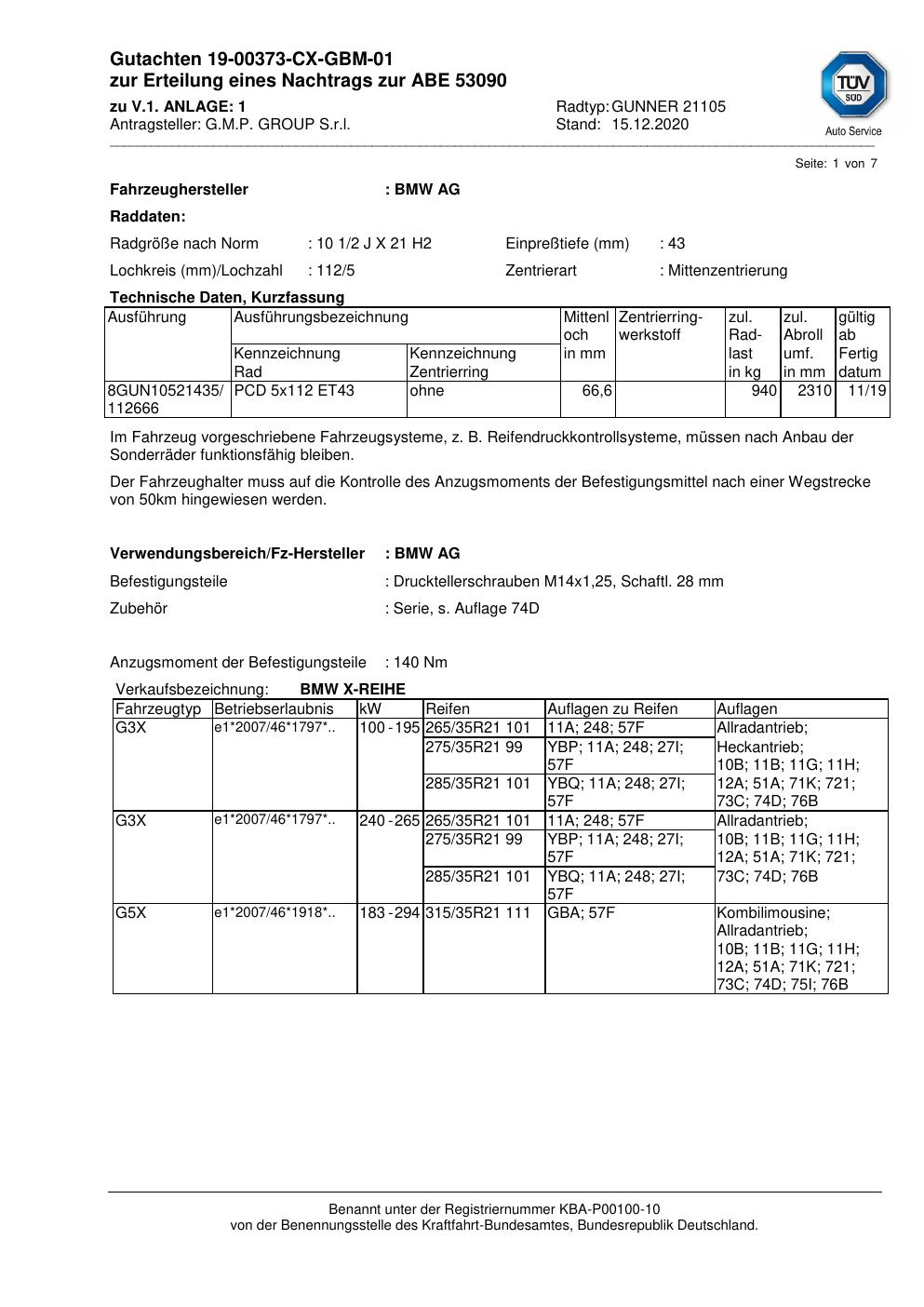 Dieses Gutachten (abe) bezieht sich auf die Alufelge ATS GUNNER 21105 in der Ausführung 2Jx21 ET 0, Mittenloch 0 mm (KBA 53090). Im PDF findest du typischerweise zulässige Reifengrößen, Auflagen/Anbauhinweise und – je nach Dokument – Hinweise zur Eintragung.