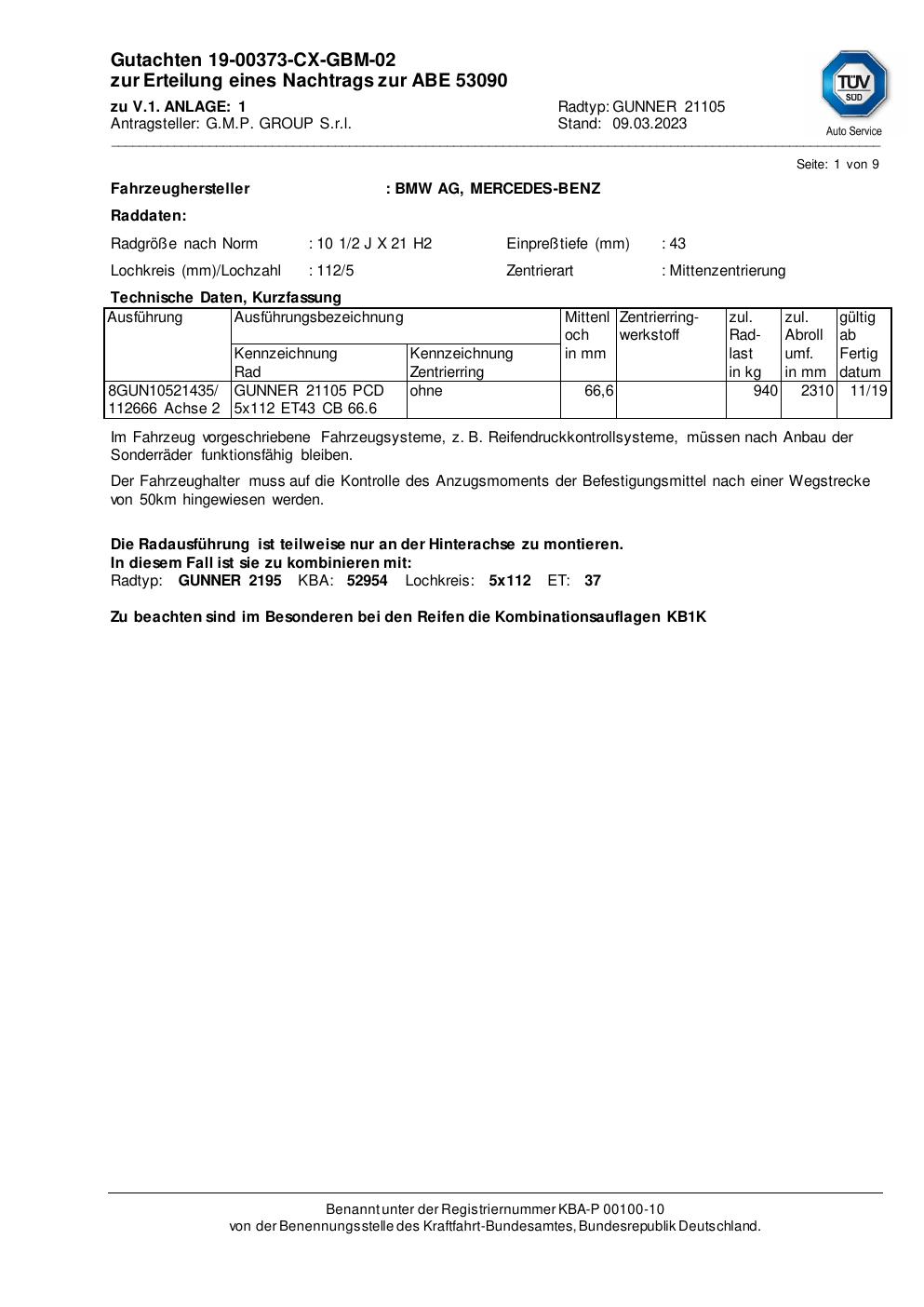 Dieses Gutachten (abe) bezieht sich auf die Alufelge ATS GUNNER 21105 in der Ausführung 2Jx21 ET 0, Mittenloch 0 mm (KBA 53090). Im PDF findest du typischerweise zulässige Reifengrößen, Auflagen/Anbauhinweise und – je nach Dokument – Hinweise zur Eintragung.