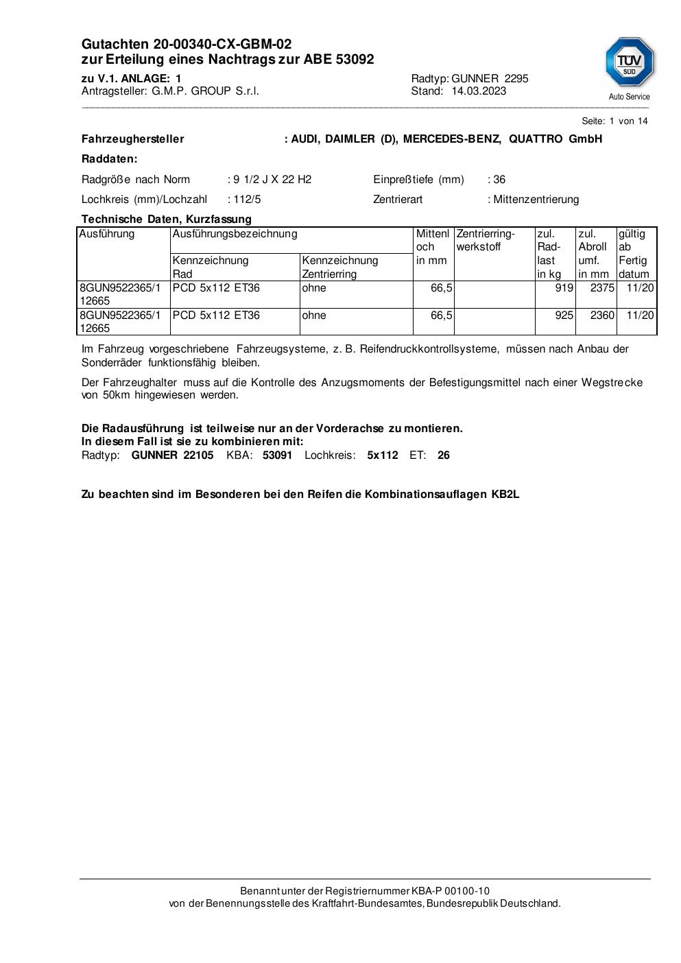 Dieses Gutachten (abe) bezieht sich auf die Alufelge ATS GUNNER 2295 in der Ausführung 2Jx22 ET 0, Mittenloch 0 mm (KBA 53092). Im PDF findest du typischerweise zulässige Reifengrößen, Auflagen/Anbauhinweise und – je nach Dokument – Hinweise zur Eintragung.