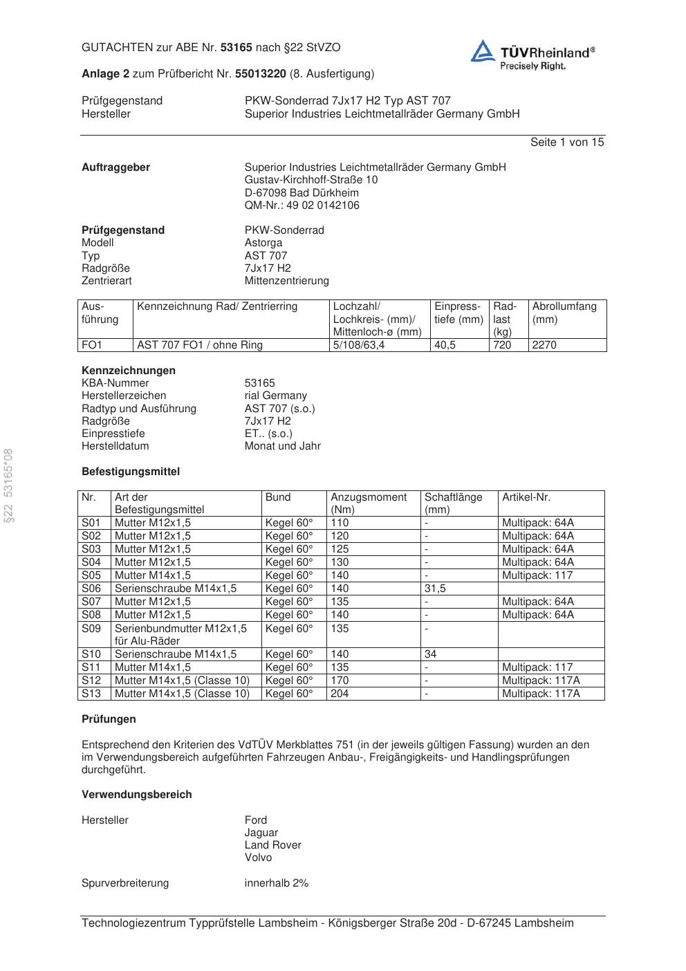 - brand-rial des folgenden Genehmigungsobjektes – 7.0Jx17 ET0.0 (KBA 53165)