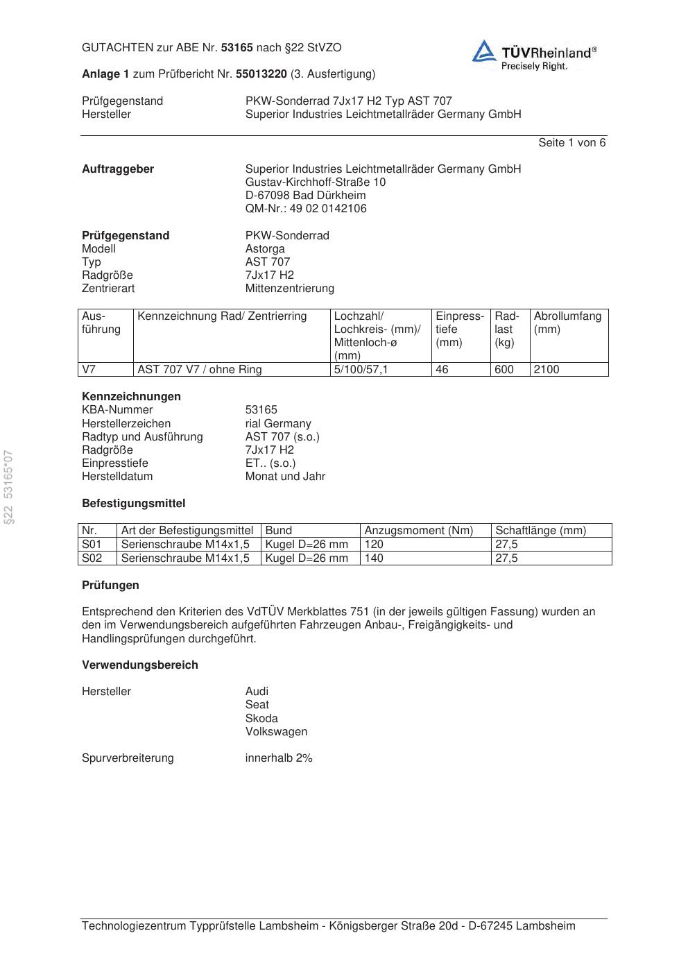 Dieses Gutachten (abe) bezieht sich auf die Alufelge brand-rial AST 707 in der Ausführung 7Jx17 ET 0, Mittenloch 0 mm (KBA 53165). Im PDF findest du typischerweise zulässige Reifengrößen, Auflagen/Anbauhinweise und – je nach Dokument – Hinweise zur Eintragung.