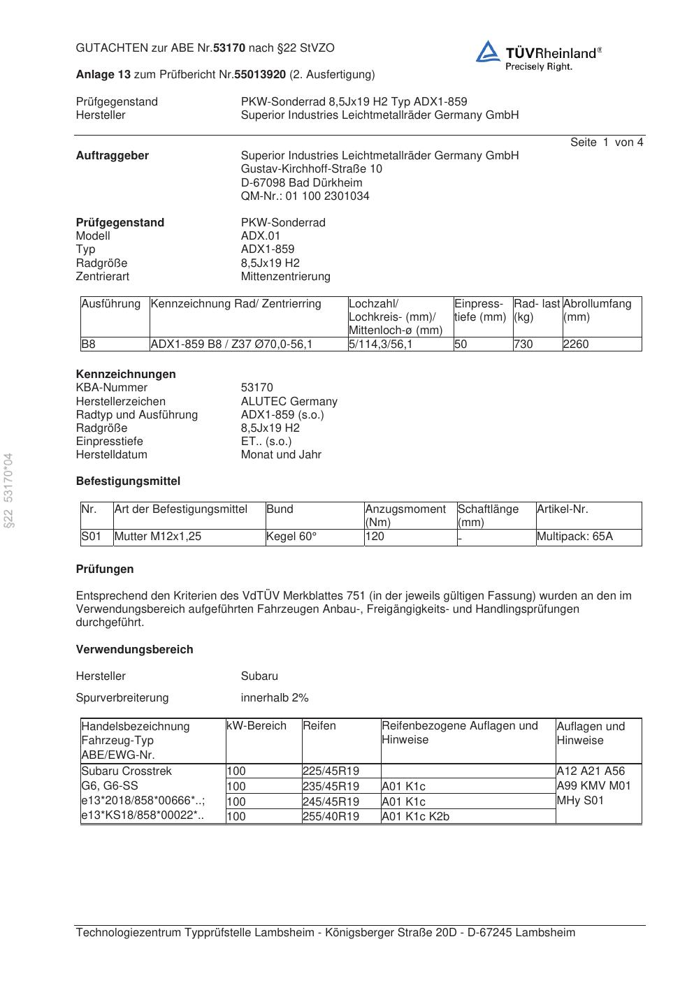 Dieses Gutachten (abe) bezieht sich auf die Alufelge ALUTEC ADX1-859 in der Ausführung 8.5Jx19 ET 0, Mittenloch 0 mm (KBA 53170). Im PDF findest du typischerweise zulässige Reifengrößen, Auflagen/Anbauhinweise und – je nach Dokument – Hinweise zur Eintragung.