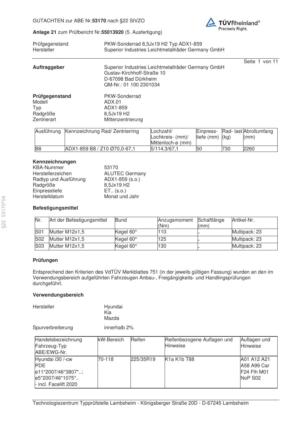 Dieses Gutachten (abe) bezieht sich auf die Alufelge ALUTEC ADX1-859 in der Ausführung 8.5Jx19 ET 0, Mittenloch 0 mm (KBA 53170). Im PDF findest du typischerweise zulässige Reifengrößen, Auflagen/Anbauhinweise und – je nach Dokument – Hinweise zur Eintragung.