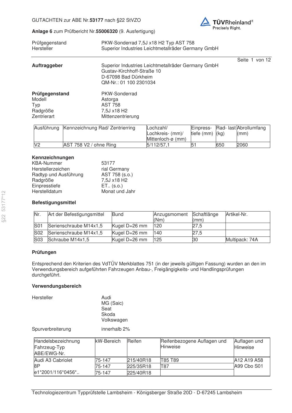 Dieses Gutachten (abe) bezieht sich auf die Alufelge brand-rial AST 758 in der Ausführung 7.5Jx18 ET 0, Mittenloch 0 mm (KBA 53177). Im PDF findest du typischerweise zulässige Reifengrößen, Auflagen/Anbauhinweise und – je nach Dokument – Hinweise zur Eintragung.