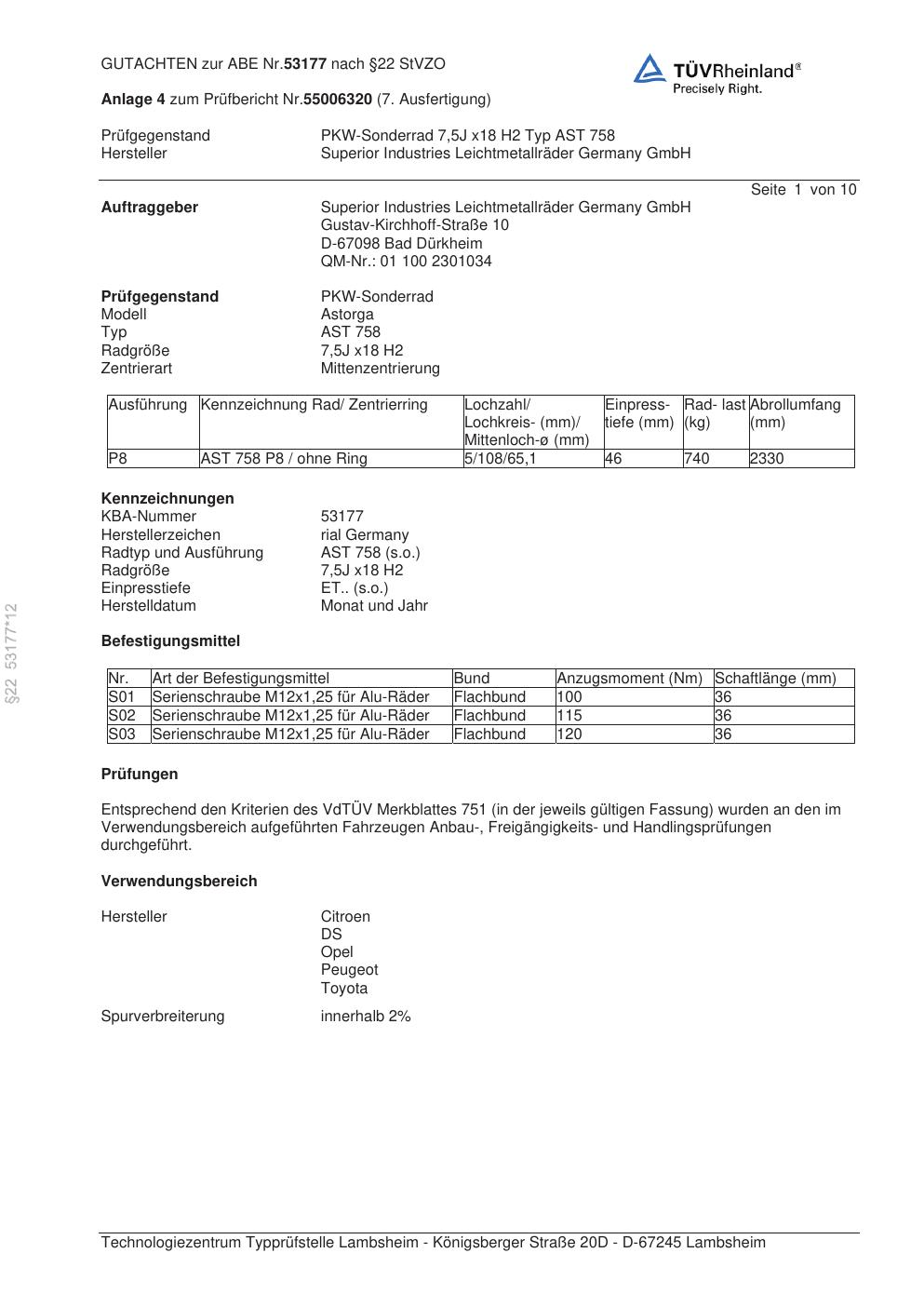 Dieses Gutachten (abe) bezieht sich auf die Alufelge brand-rial AST 758 in der Ausführung 7.5Jx18 ET 0, Mittenloch 0 mm (KBA 53177). Im PDF findest du typischerweise zulässige Reifengrößen, Auflagen/Anbauhinweise und – je nach Dokument – Hinweise zur Eintragung.