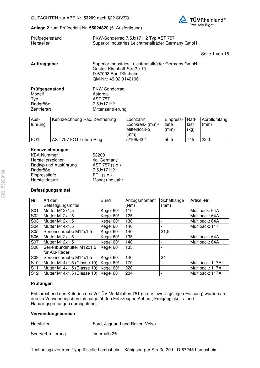 Dieses Gutachten (abe) bezieht sich auf die Alufelge brand-rial AST 757 in der Ausführung 7.5Jx17 ET 0, Mittenloch 0 mm (KBA 53209). Im PDF findest du typischerweise zulässige Reifengrößen, Auflagen/Anbauhinweise und – je nach Dokument – Hinweise zur Eintragung.