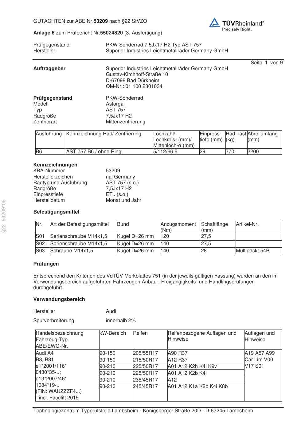 Dieses Gutachten (abe) bezieht sich auf die Alufelge brand-rial AST 757 in der Ausführung 7.5Jx17 ET 0, Mittenloch 0 mm (KBA 53209). Im PDF findest du typischerweise zulässige Reifengrößen, Auflagen/Anbauhinweise und – je nach Dokument – Hinweise zur Eintragung.
