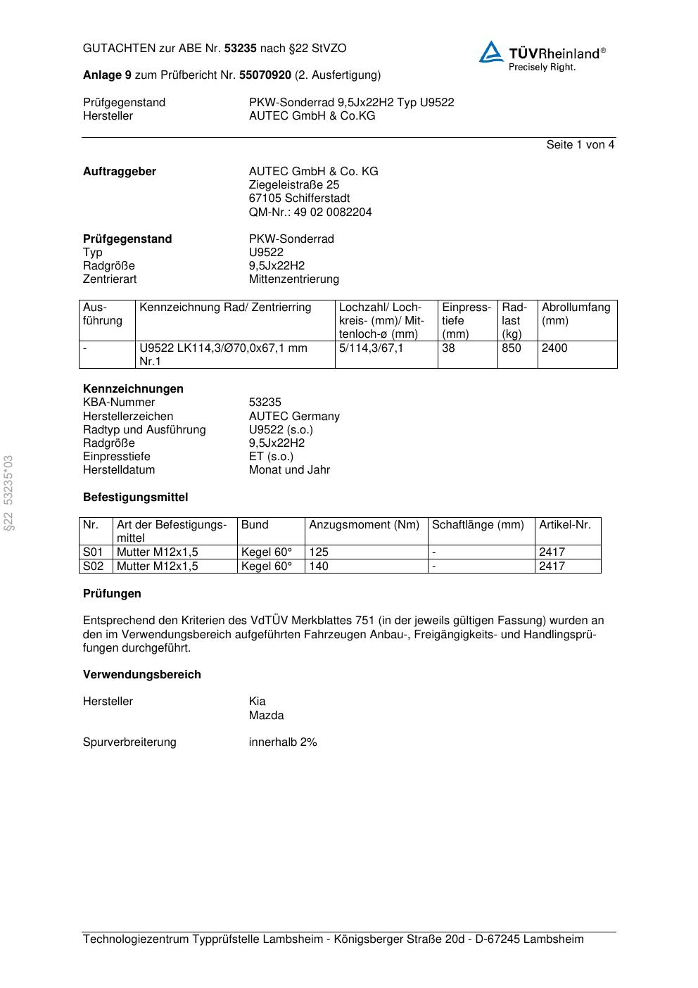 Dieses Gutachten (abe) bezieht sich auf die Alufelge Autec U9522 in der Ausführung 9.5Jx22 ET 0, Mittenloch 0 mm (KBA 53235). Im PDF findest du typischerweise zulässige Reifengrößen, Auflagen/Anbauhinweise und – je nach Dokument – Hinweise zur Eintragung.