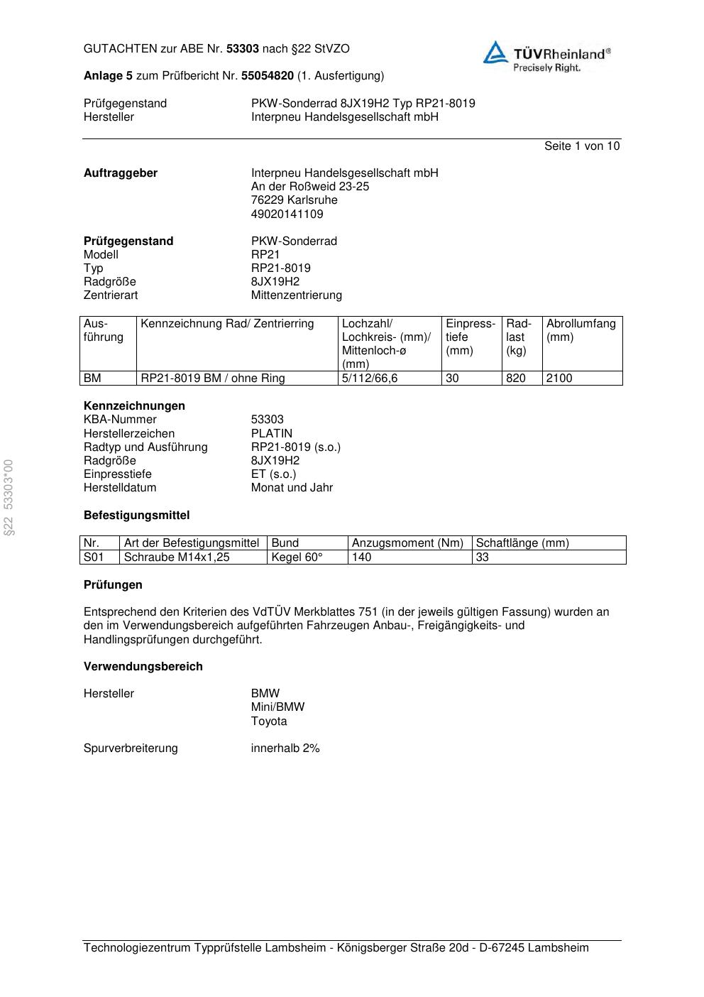 Dieses Gutachten (abe) bezieht sich auf die Alufelge Platin RP21-8019 in der Ausführung 8Jx19 ET 0, Mittenloch 0 mm (KBA 53303). Im PDF findest du typischerweise zulässige Reifengrößen, Auflagen/Anbauhinweise und – je nach Dokument – Hinweise zur Eintragung.
