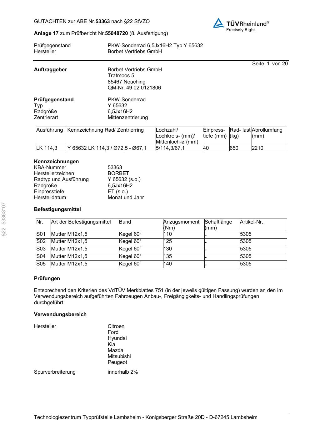 Dieses Gutachten (abe) bezieht sich auf die Alufelge Borbet Y 65632 in der Ausführung 6.5Jx16 ET 0, Mittenloch 0 mm (KBA 53363). Im PDF findest du typischerweise zulässige Reifengrößen, Auflagen/Anbauhinweise und – je nach Dokument – Hinweise zur Eintragung.