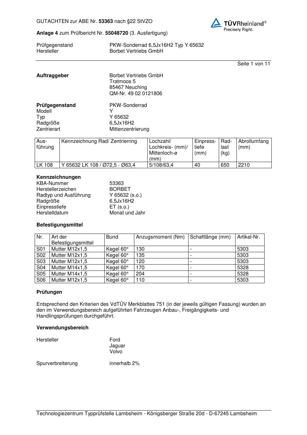 Dieses Gutachten (abe) bezieht sich auf die Alufelge Borbet Y 65632 in der Ausführung 6.5Jx16 ET 0, Mittenloch 0 mm (KBA 53363). Im PDF findest du typischerweise zulässige Reifengrößen, Auflagen/Anbauhinweise und – je nach Dokument – Hinweise zur Eintragung.