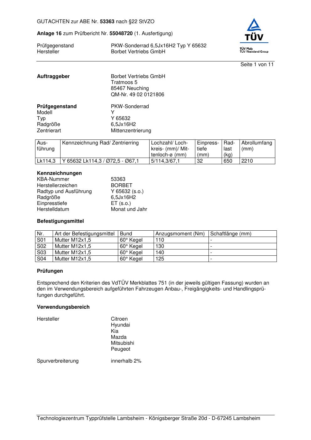 Dieses Gutachten (abe) bezieht sich auf die Alufelge Borbet Y 65632 in der Ausführung 6.5Jx16 ET 0, Mittenloch 0 mm (KBA 53363). Im PDF findest du typischerweise zulässige Reifengrößen, Auflagen/Anbauhinweise und – je nach Dokument – Hinweise zur Eintragung.