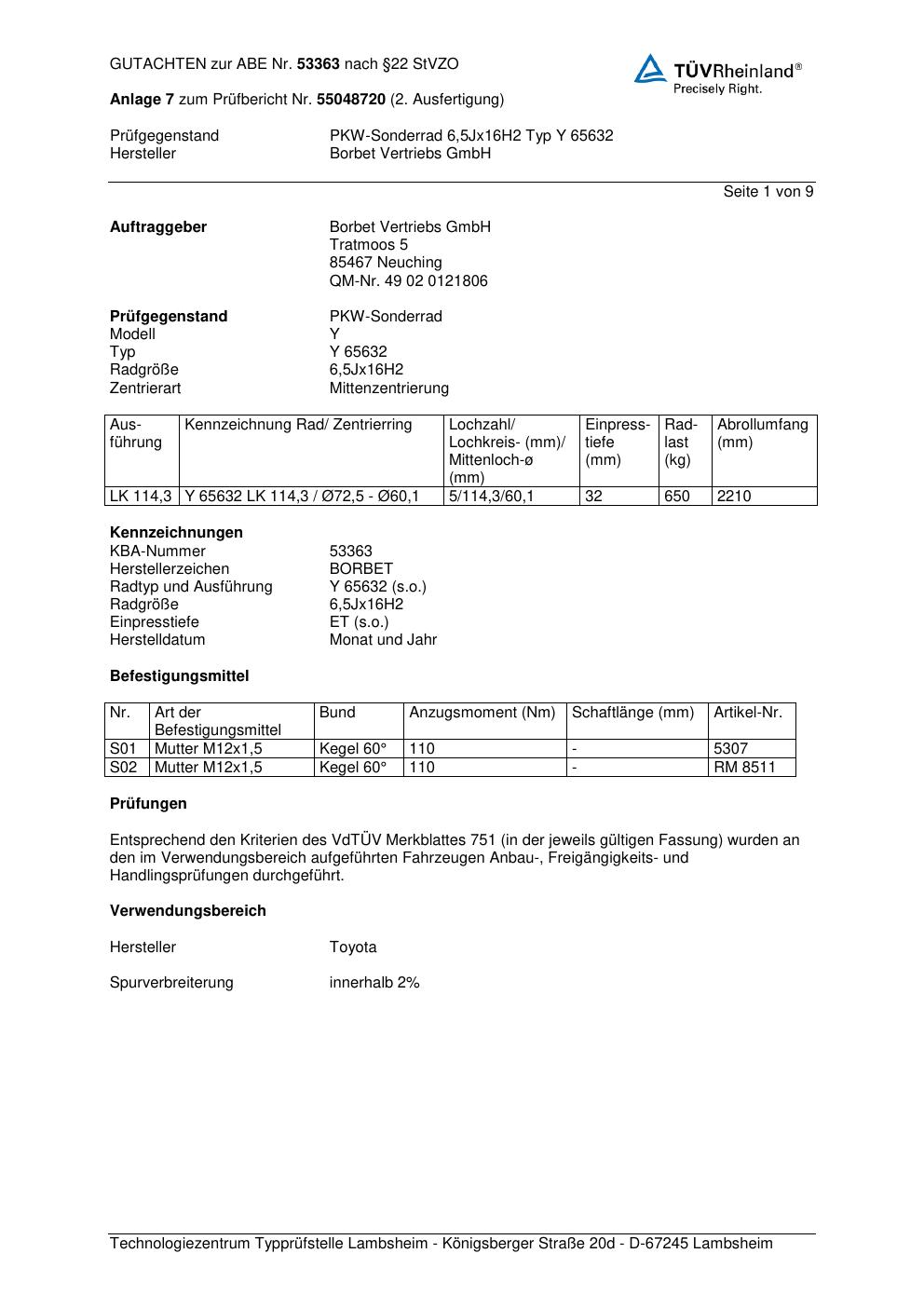 Dieses Gutachten (abe) bezieht sich auf die Alufelge Borbet Y 65632 in der Ausführung 6.5Jx16 ET 0, Mittenloch 0 mm (KBA 53363). Im PDF findest du typischerweise zulässige Reifengrößen, Auflagen/Anbauhinweise und – je nach Dokument – Hinweise zur Eintragung.