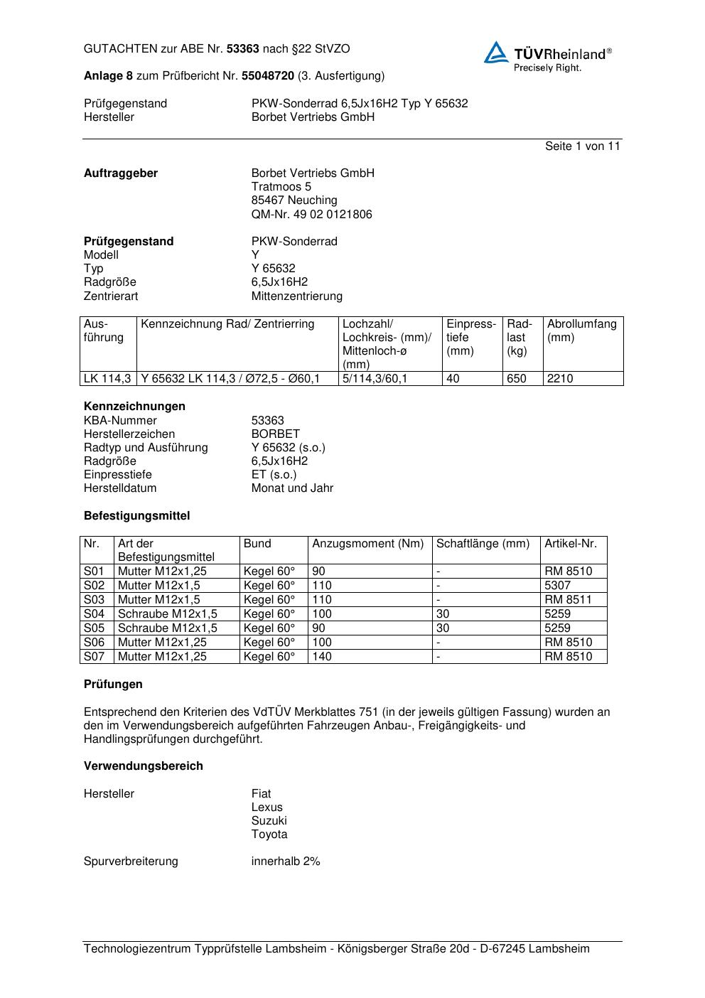 Dieses Gutachten (abe) bezieht sich auf die Alufelge Borbet Y 65632 in der Ausführung 6.5Jx16 ET 0, Mittenloch 0 mm (KBA 53363). Im PDF findest du typischerweise zulässige Reifengrößen, Auflagen/Anbauhinweise und – je nach Dokument – Hinweise zur Eintragung.