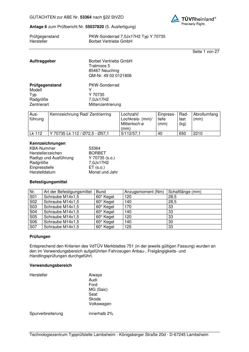 Dieses Gutachten (abe) bezieht sich auf die Alufelge Borbet Y 70735 in der Ausführung 7Jx17 ET 0, Mittenloch 0 mm (KBA 53364). Im PDF findest du typischerweise zulässige Reifengrößen, Auflagen/Anbauhinweise und – je nach Dokument – Hinweise zur Eintragung.