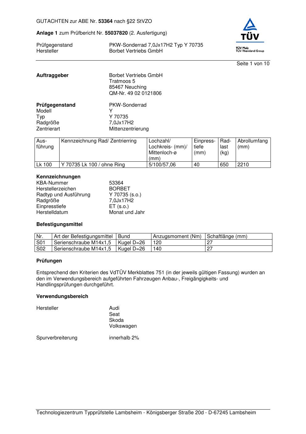 Dieses Gutachten (abe) bezieht sich auf die Alufelge Borbet Y 70735 in der Ausführung 7Jx17 ET 0, Mittenloch 0 mm (KBA 53364). Im PDF findest du typischerweise zulässige Reifengrößen, Auflagen/Anbauhinweise und – je nach Dokument – Hinweise zur Eintragung.