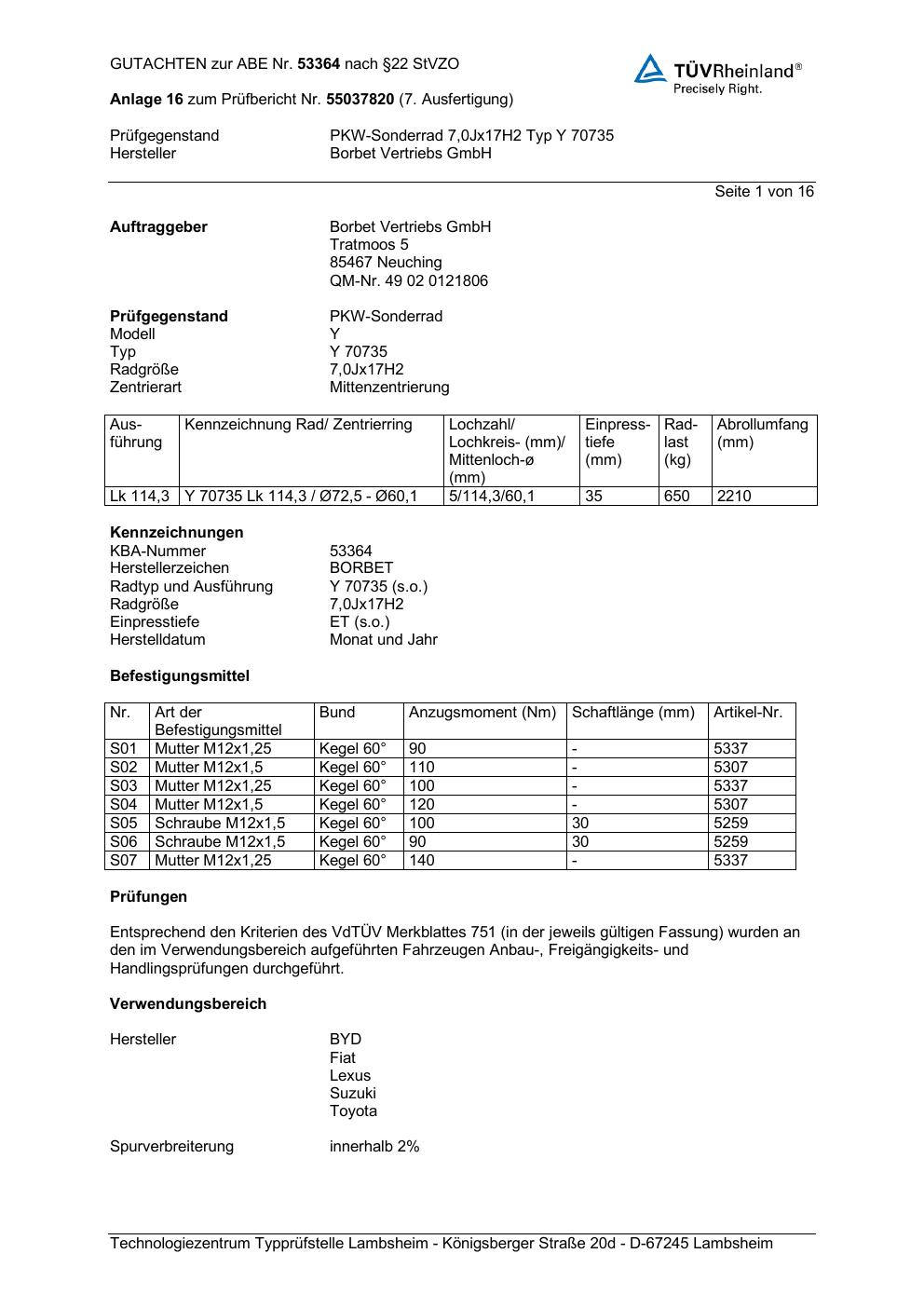 Dieses Gutachten (abe) bezieht sich auf die Alufelge Borbet Y 70735 in der Ausführung 7Jx17 ET 0, Mittenloch 0 mm (KBA 53364). Im PDF findest du typischerweise zulässige Reifengrößen, Auflagen/Anbauhinweise und – je nach Dokument – Hinweise zur Eintragung.