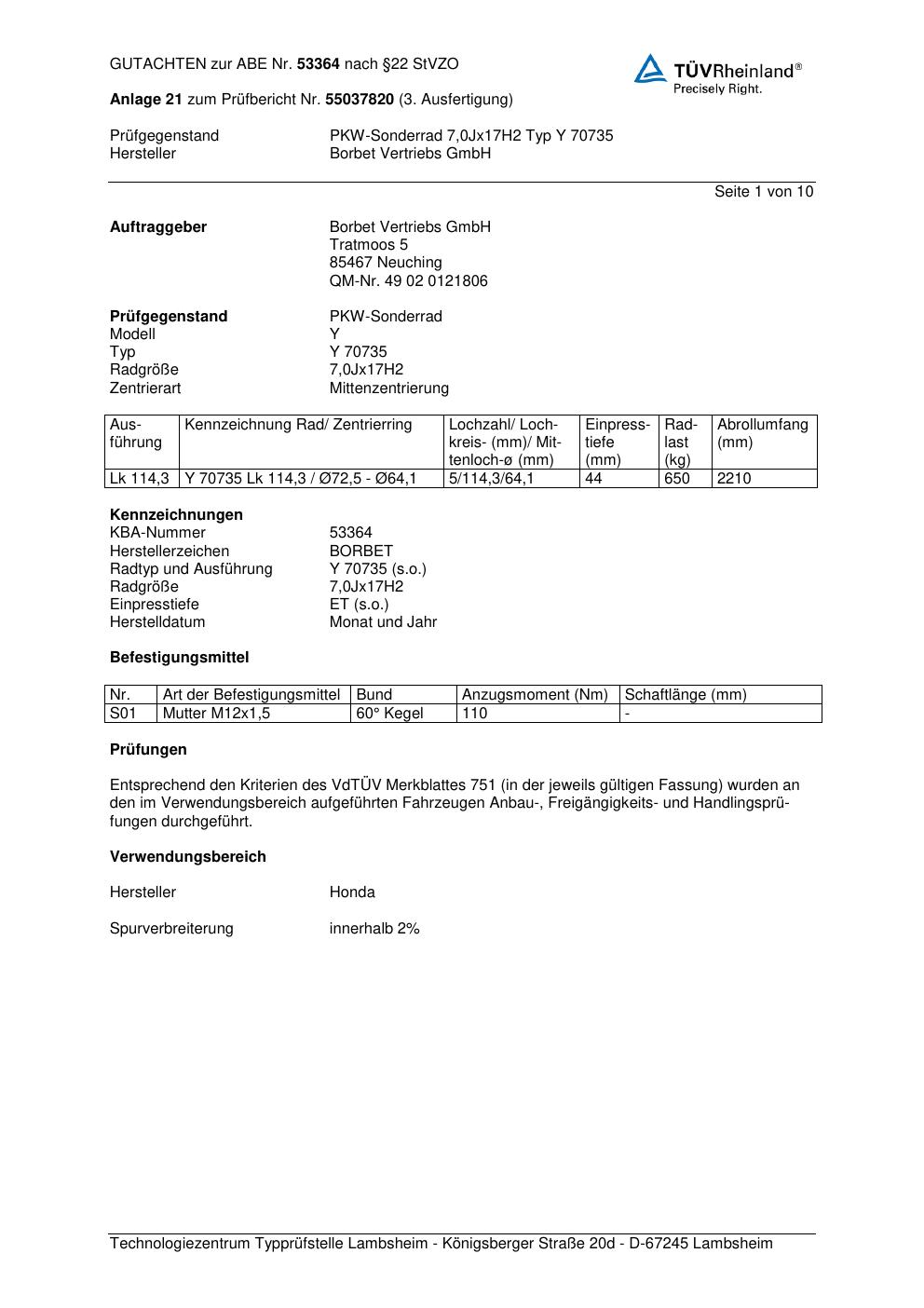 Dieses Gutachten (abe) bezieht sich auf die Alufelge Borbet Y 70735 in der Ausführung 7Jx17 ET 0, Mittenloch 0 mm (KBA 53364). Im PDF findest du typischerweise zulässige Reifengrößen, Auflagen/Anbauhinweise und – je nach Dokument – Hinweise zur Eintragung.
