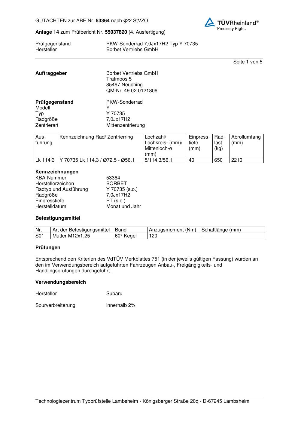 Dieses Gutachten (abe) bezieht sich auf die Alufelge Borbet Y 70735 in der Ausführung 7Jx17 ET 0, Mittenloch 0 mm (KBA 53364). Im PDF findest du typischerweise zulässige Reifengrößen, Auflagen/Anbauhinweise und – je nach Dokument – Hinweise zur Eintragung.