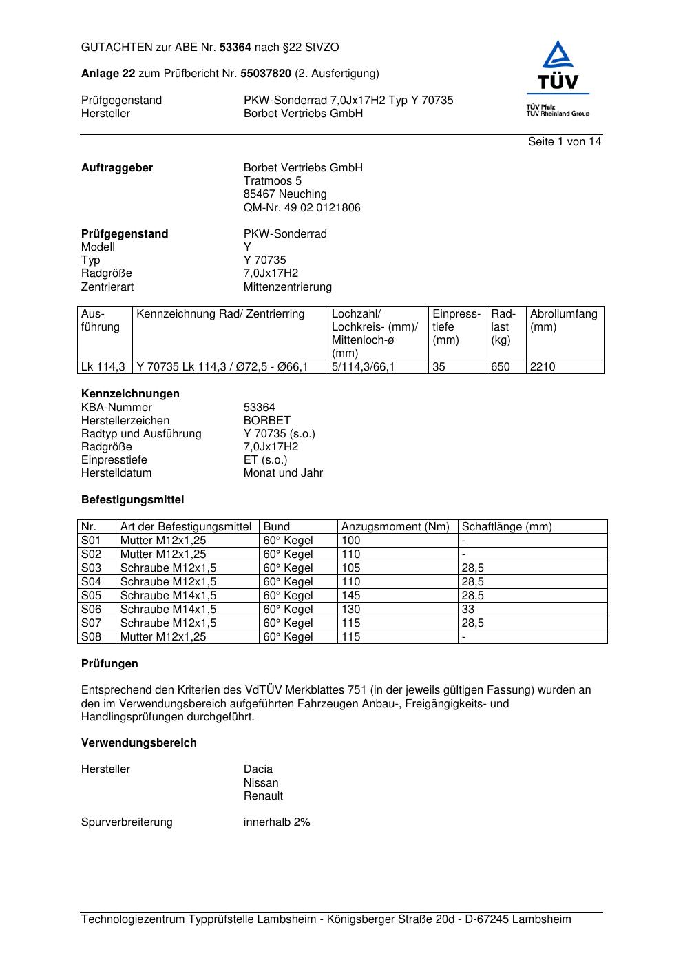 Dieses Gutachten (abe) bezieht sich auf die Alufelge Borbet Y 70735 in der Ausführung 7Jx17 ET 0, Mittenloch 0 mm (KBA 53364). Im PDF findest du typischerweise zulässige Reifengrößen, Auflagen/Anbauhinweise und – je nach Dokument – Hinweise zur Eintragung.