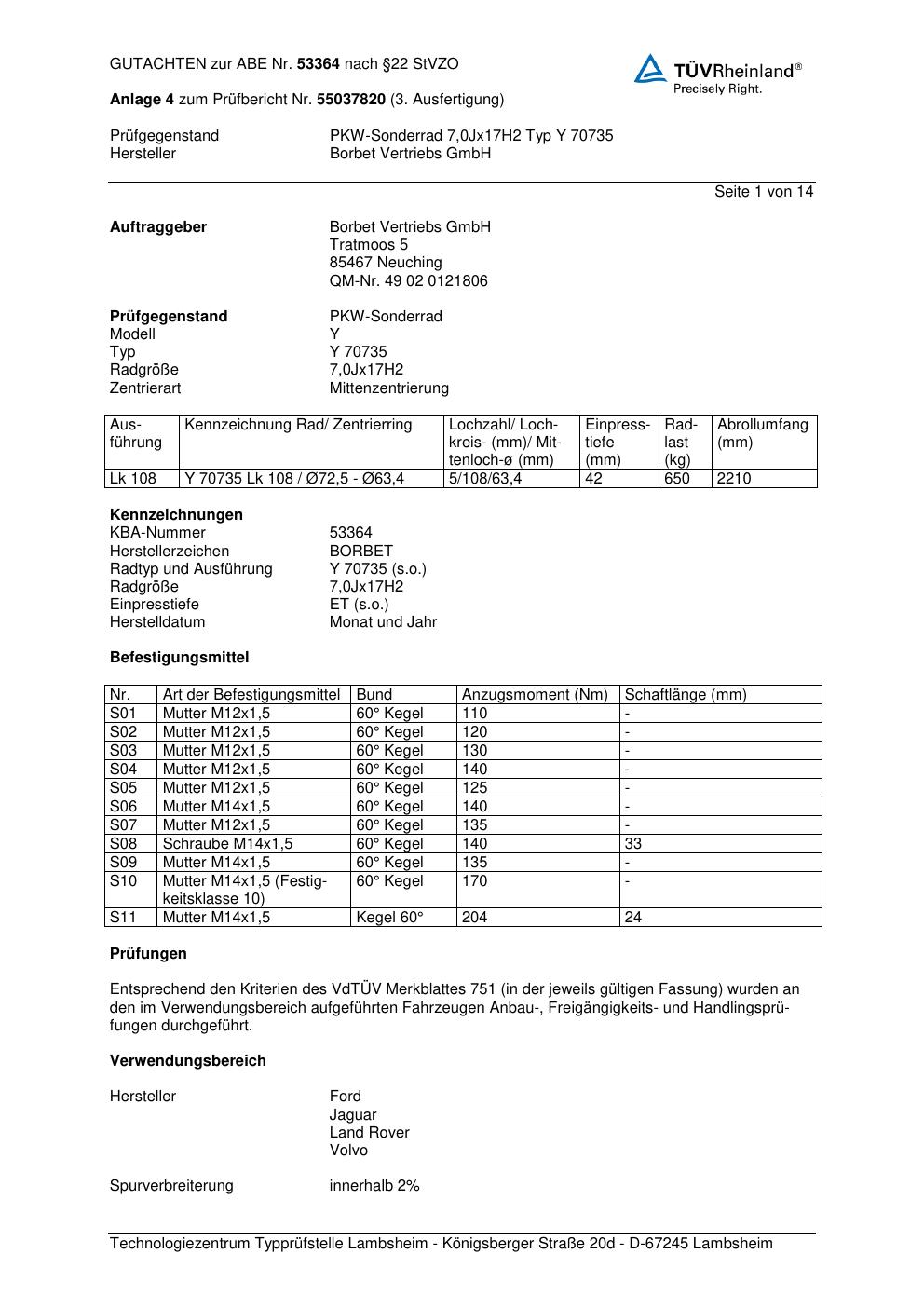 Dieses Gutachten (abe) bezieht sich auf die Alufelge Borbet Y 70735 in der Ausführung 7Jx17 ET 0, Mittenloch 0 mm (KBA 53364). Im PDF findest du typischerweise zulässige Reifengrößen, Auflagen/Anbauhinweise und – je nach Dokument – Hinweise zur Eintragung.